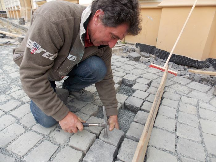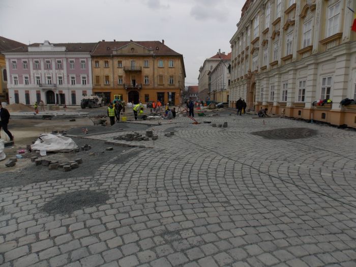 Pe margini, pavajul va fi asezat in forma de cozi de paun. Muncitorii au pus deja primele pietre langa Muzeul Baroc.