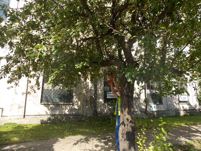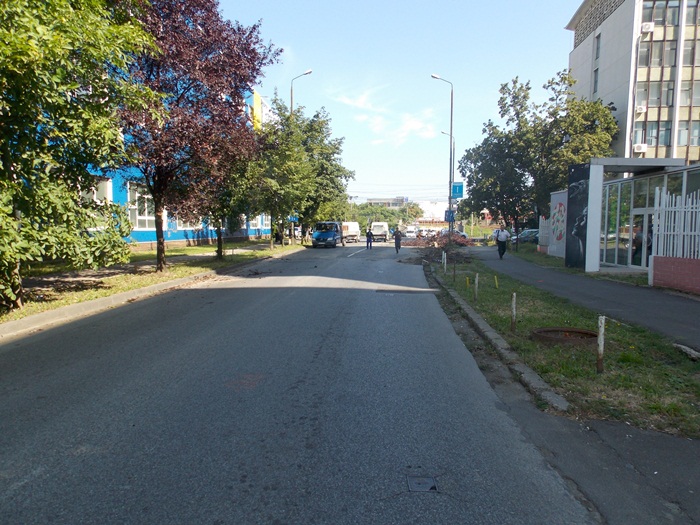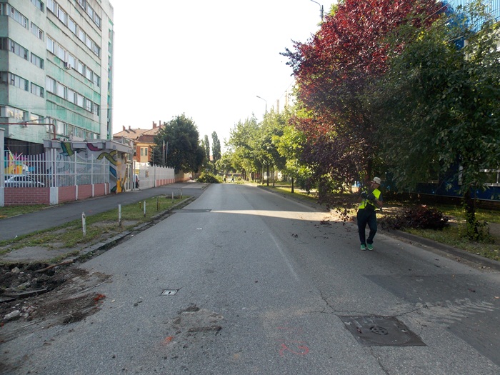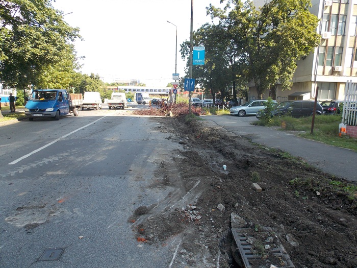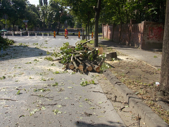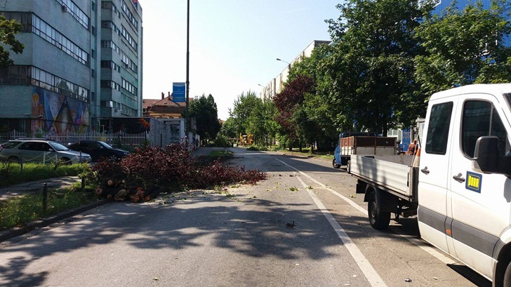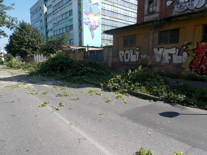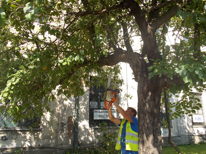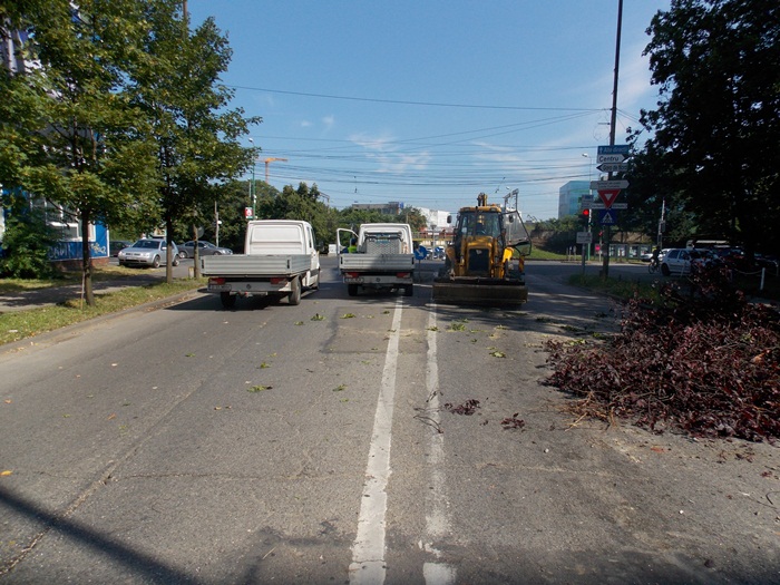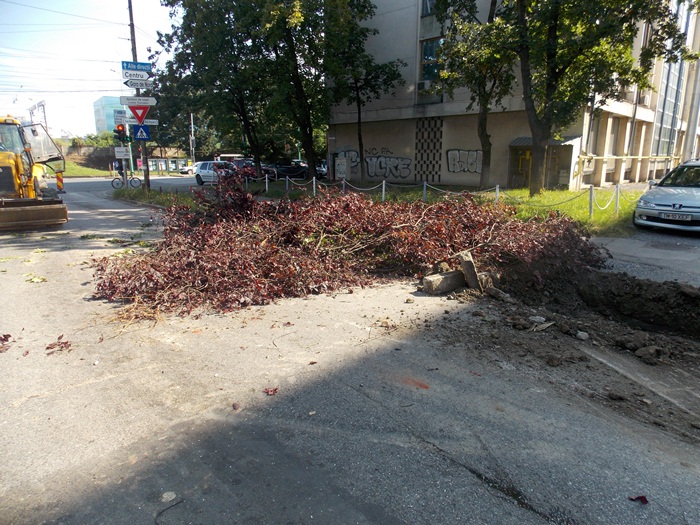 Odata cu blocarea strazii Jiul muncitorii au inceput sa taie copacii. In prima faza, cei care sunt mai mari vor fi toaletati, apoi taiati complet din locul unde sunt, fara a fi afectate cablurile care mai trec prin acea zona. Patru dintre arbori, care sunt mai mici, vor fi scosi din pamant si replantati in Parcul Central.