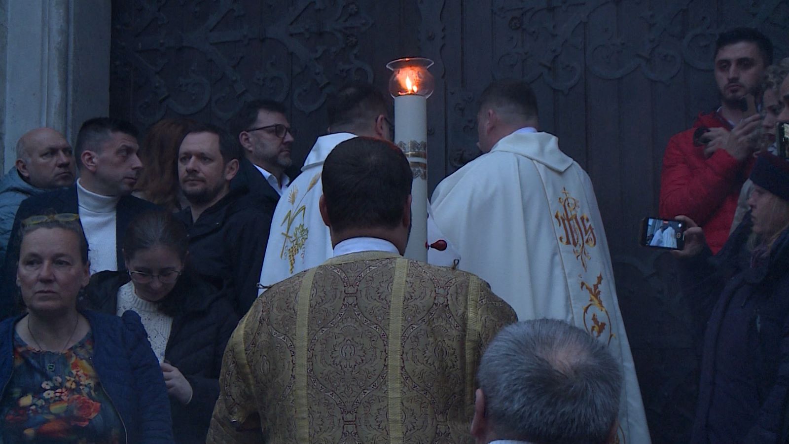 Slujba a inceput cu sfintirea unui foc aprins in fata bisericii, foc din care se ia apoi lumina si se aprind lumanarile. Apoi, soborul de preoti si credinciosii au intrat in biserica.