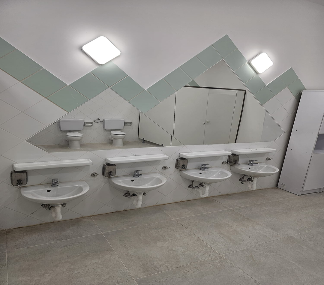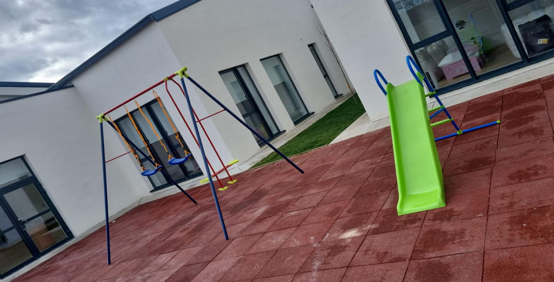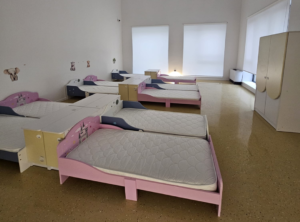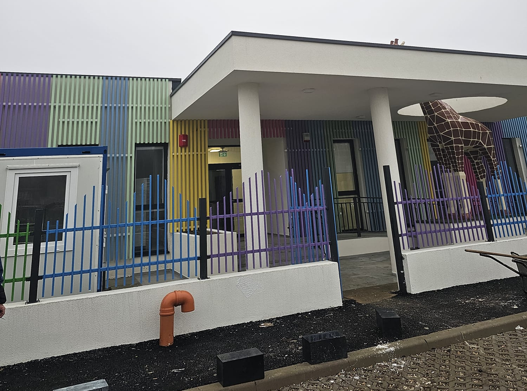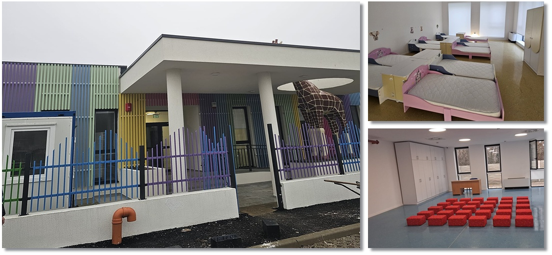 Clădirea cu fațadă multicoloră include săli de joacă moderne, dormitoare spațioase, o bucătărie complet utilată, spălătorie proprie, sală festivă pentru evenimente, cabinet medical, spații administrative moderne și un teren de joacă generos în aer liber.