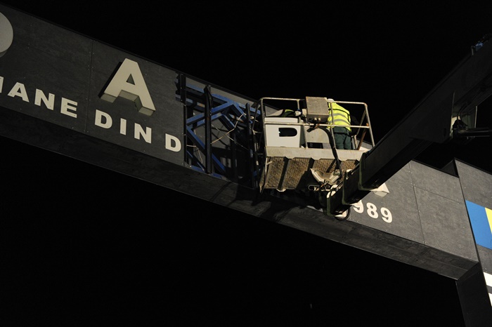 TIMISOARA. Noapte alba pentru mai multi angajati ai ISU Timis si ai Colterm care s-au apucat sa demonteze panourile de fibrociment de pe poarta geamana a celei care a ucis un tanar la furtuna din 17 septembrie.