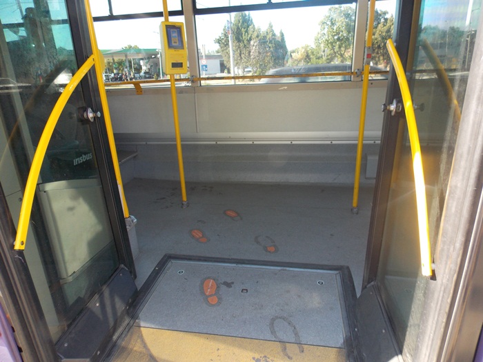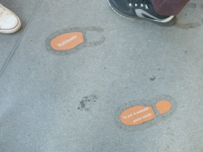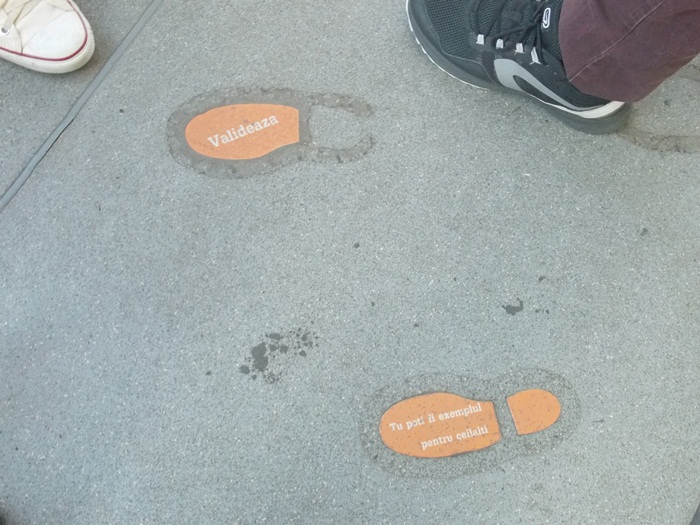 Au fost imprimate cinci urme de pasi care duc de la usa direct catre aparatul de taxat sau validat. Pe unul dintre pasi sta scris “Valideaza!“, iar pe al doilea: “Tu poti fi exemplul pentru ceilalti“.