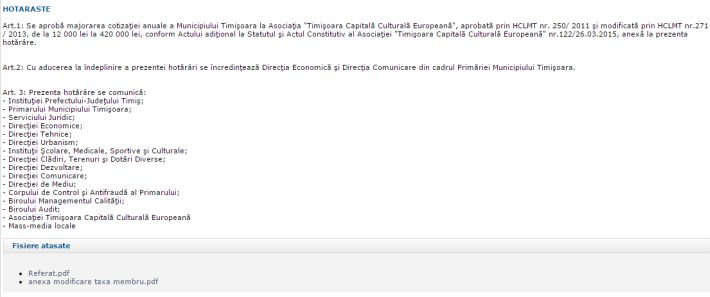 Cei din Asociatia Timisoara Capitala Culturala Europeana au considerat insa ca este cazul sa ceara mai multi bani de la membri, asa ca au trimis o adresa primariei, cerand aprobarea maririi cuantului cotizatiei pentru anul 2015, “pentru acoperirea cheltuielilor legate de formarea unei echipe de lucru de minim 12 persoane, fara director executiv si asistent, care sa lucreze la intocmirea dosarului de candidatura”. Adunarea Generala a asociatiei a aprobat deja marirea cotizatiei primariei, inca din luna martie.