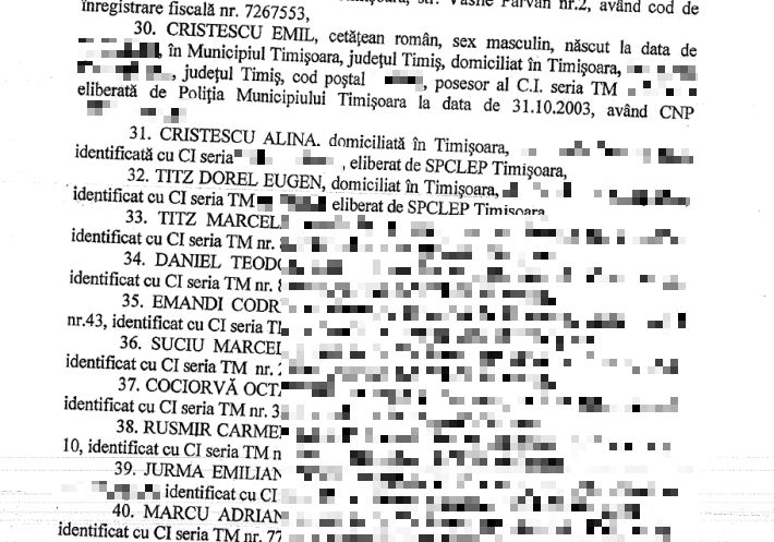 Pe site-ul Primariei Timisoara a fost publicat deja proiectul de hotarare prin care se solicita marirea cotizatiei. Reprezentantii municipalitatii risca sa fie din nou amendati, dupa ce au facut publica o anexa cu mai multe date ce contin caracter personal. Este vorba despre o anexa in care sunt trecuti membrii fondatori ai asociatiei, majoritatea oameni de afaceri din oras, cu tot cu serie si numar de buletin si adrese. Printre acestia se numara si omul de afaceri Emil Cristescu, caruia i-a fost facut public si CNP-ul. Pe lista se afla peste 100 de membri. Intre timp, functionarii primariei au reusit sa scoata anexa cu lista membrilor din proiect, insa nu si sa o stearga de pe site…