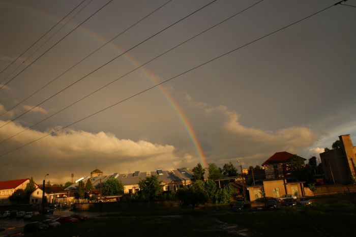 TIMISOARA. Spectacol pe cer, luni seara, la Timisoara. Ploaia cazuta peste oras pe parcursul intregii zile a curatat atmosfera si a scos la iveala un curcubeu de toata frumusetea.