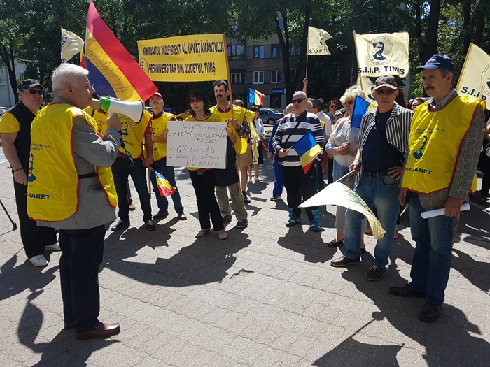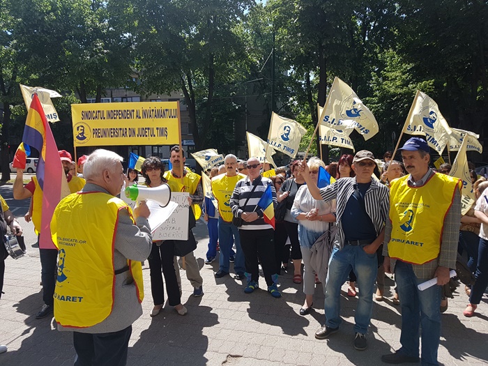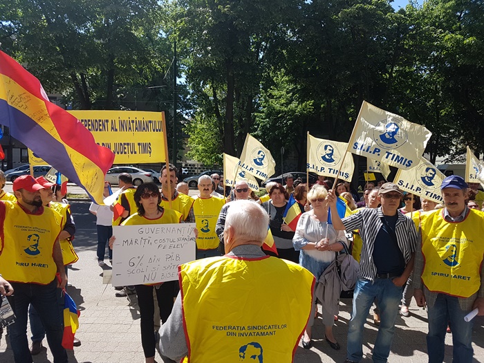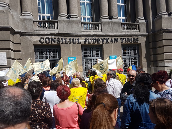Peste o suta de profesori au pichetat sediul Prefecturii Timis, vineri. Au huiduit Guvernul, au batut la tobe si au purtat discutii despre schimbarile din sistemul de invatamant care i-au adus in aceasta situatie.