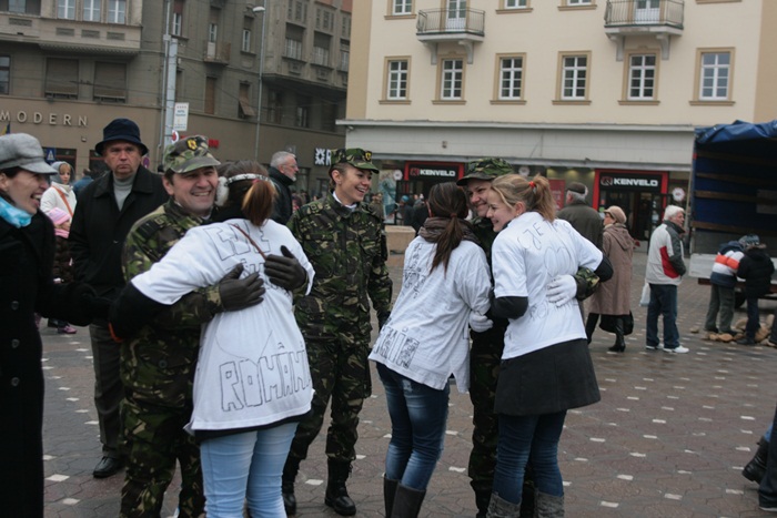 Pe scena din fata Operei au urcat copiii de la Palatul Copiilor care au interpretat cantece vesele si au fost aplaudati de sutele de persoane aflate pe platoul din fata Teatrului National. In acelasi timp, cativa tineri din Consiliul Judetean al Elevilor au oferit timisorenilor imbratisari gratuite.