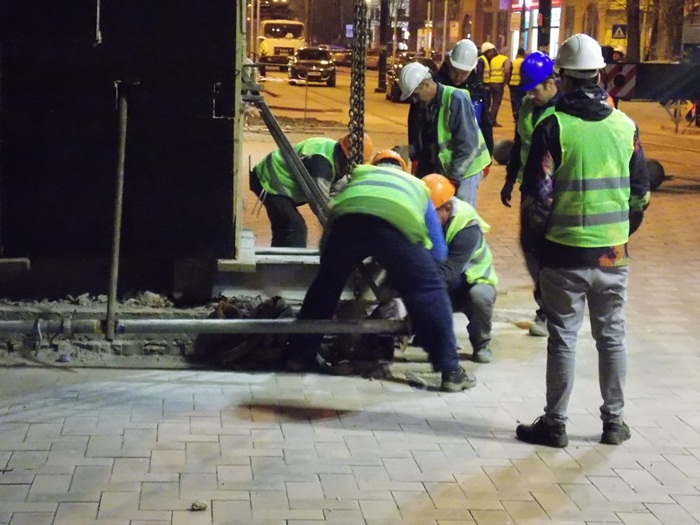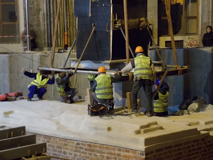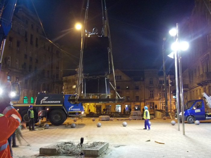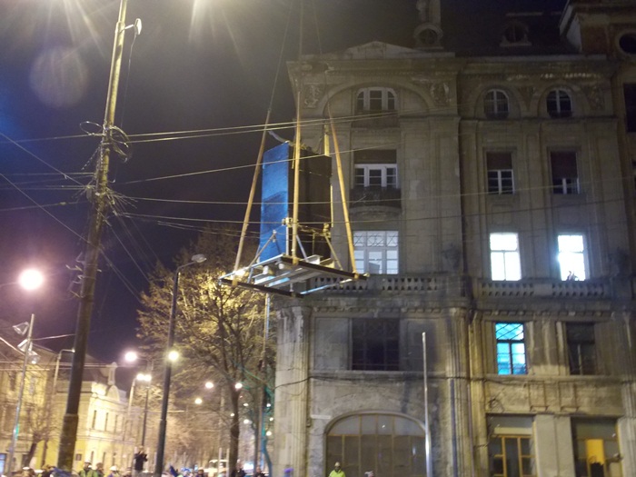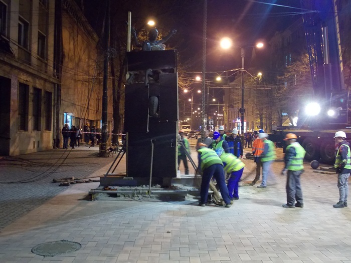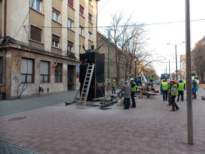 Inca de la ora 18 a fost intrerupta circulatia tramvaielor, iar in zona a fost adusa o macara, cu care urmeaza a fost mutata statuia. Muncitorii Enel au lucrat la scoaterea de sub tensiune a firelor de curent si de tramvai, iar apoi au prins statuia in chingi, pentru a o muta peste liniile de tramvai. Statuia a fost apoi ridicata peste firele de electrivitate, pentru a fi mutata in noul ei loc.
