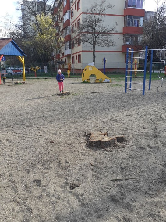 Pericol pentru copii si intr-un loc de joaca din Timisoara. Mai multi copaci au fost taiati de reprezentantii primariei in parcul de langa Cimitirul Eroilor, din zona Lipovei, insa muncitorii au lasat in urma cioturi de care cei mici se pot impiedica si se pot produce accidente, mai ales ca locul de joaca este prevazut cu pietris amestecat cu nisip.