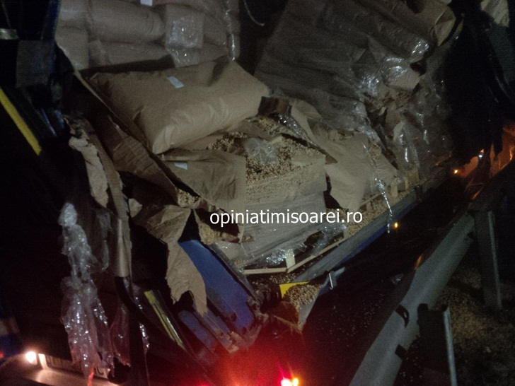 In fata mergea un camion romanesc incarcat cu lemne. Acesta a fost izbit de un tir plin cu varza, condus de o soferita din Ungaria. Un al doilea autotren, cu numere de Polonia, incarcat cu pufarine, care venea din spate, a lovit autotrenul cu varza, iar in urma lor, un tir turcesc, cu mase plastice, l-a ciocnit pe cel cu pufarine.