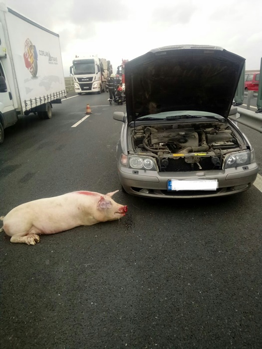 Dintr-un camion a cazut un porc, iar soferul masinii nu a observat ca a pierdut din ‘incarcatura’, astfel ca si-a continuat linistit drumul.