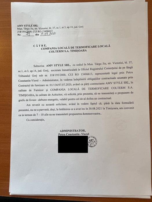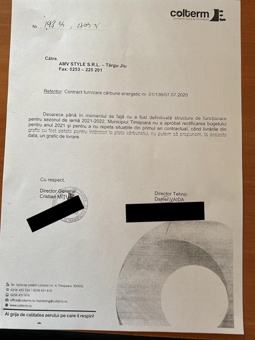 Conform acestora, desi solicitase inca din vara un grafic de livrari, furnizorul de carbune l-a primit abia in urma cu 9 zile, in data de 5 octombrie. Intr-un raspuns catre Colterm, firma a precizat ca are nevoie de timp pentru a se putea organiza cu transportul, subliniind ca trebuie si schimbat pretul in contractul cadru.