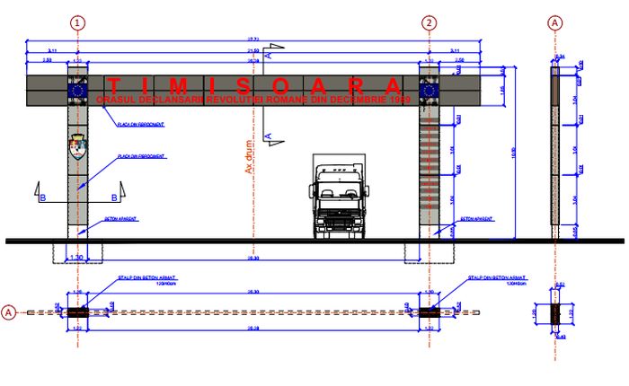 “Va fi scris <<Timisoara, orasul declansarii Revolutiei Romane din Decembrie 1989>>. Pe o coloana vor fi enumerate orasele infratite, iar pe cealalta coloana va fi stema orasului. In partea superioara pe o parte drapelul UE, iar pe cealalta drapelul Romaniei. Le vom ilumina, desigur”, explica Robu.