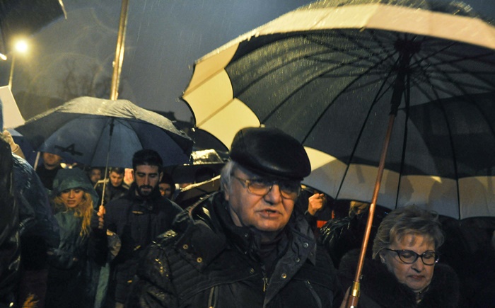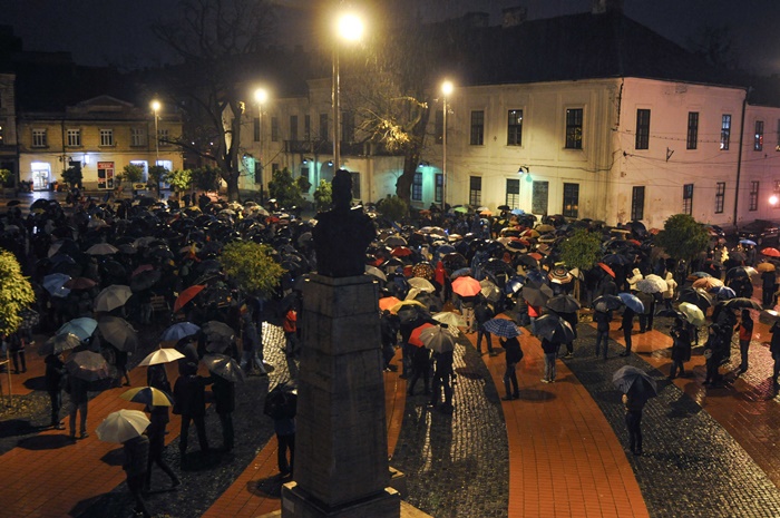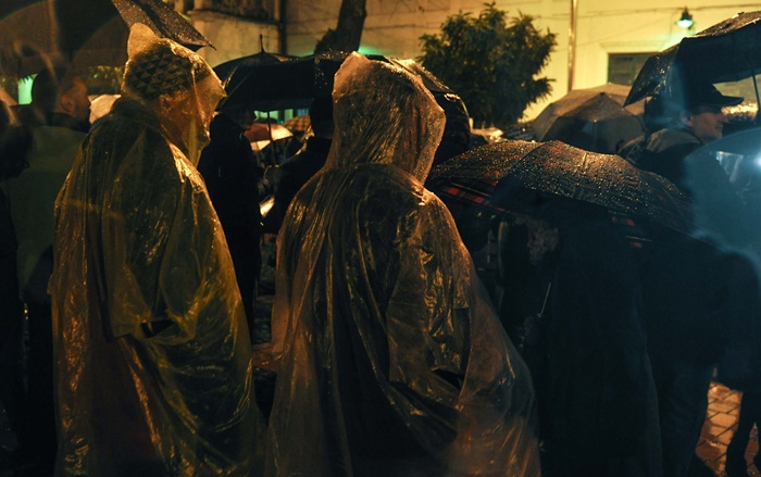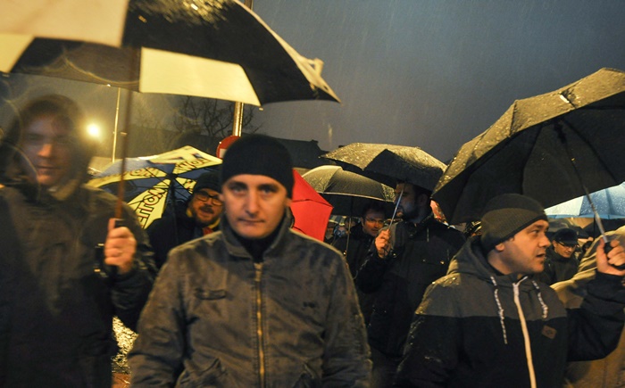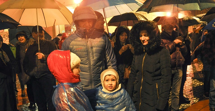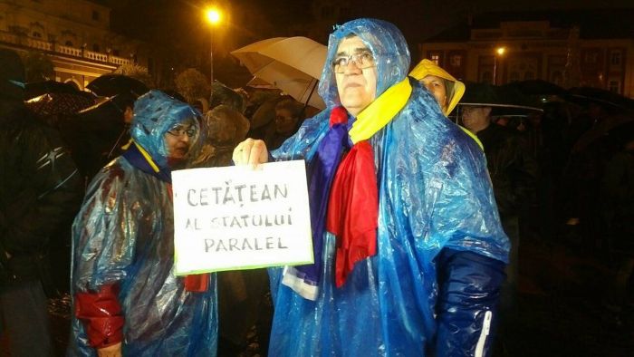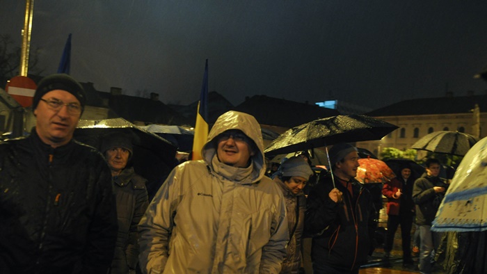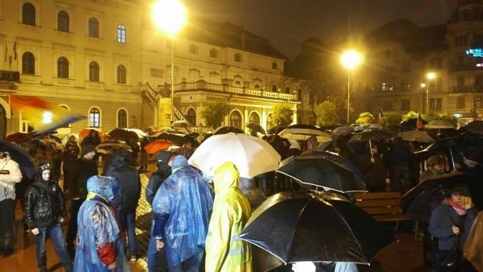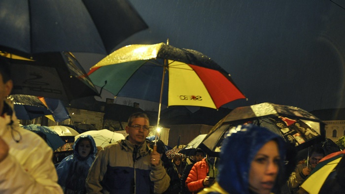 Si pentru ca afata ploua mocaneste, protestatarii au cu ei umbrele. Cei care au uitat umbrela acasa, au primit pelerine din partea organizatorilor.