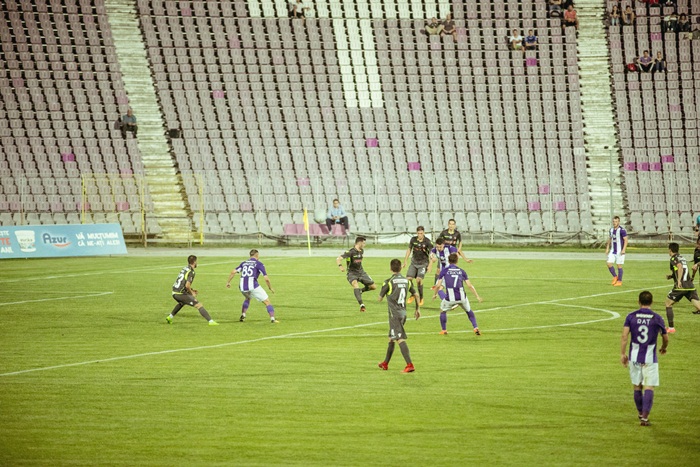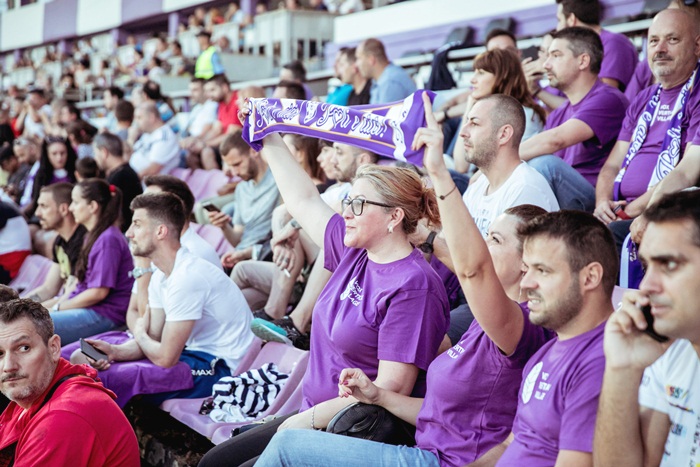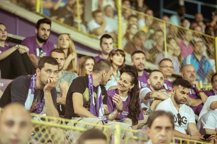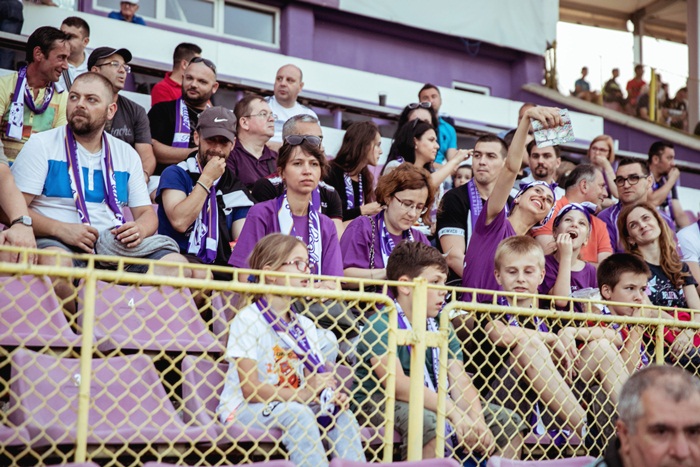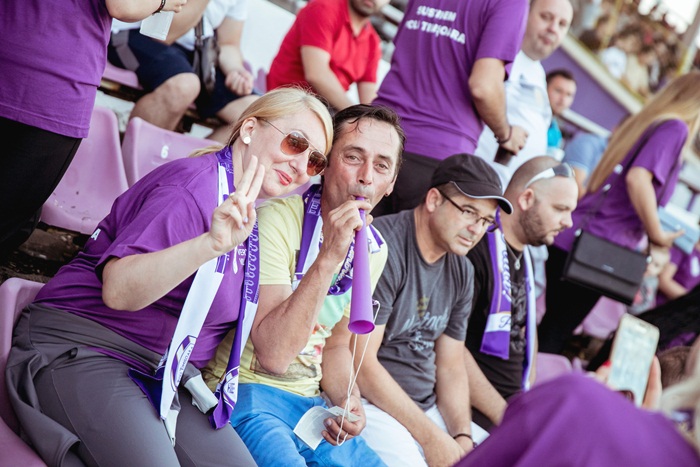 Cu o jumatate de ora inainte de meci, cei de la Vox Technology Park, imbracati in tricouri violet si cu fularele traditionale la gat au luat loc la tribuna 0, care s-a transformat intr-o veritabila galerie pentru formatia timisoreana.