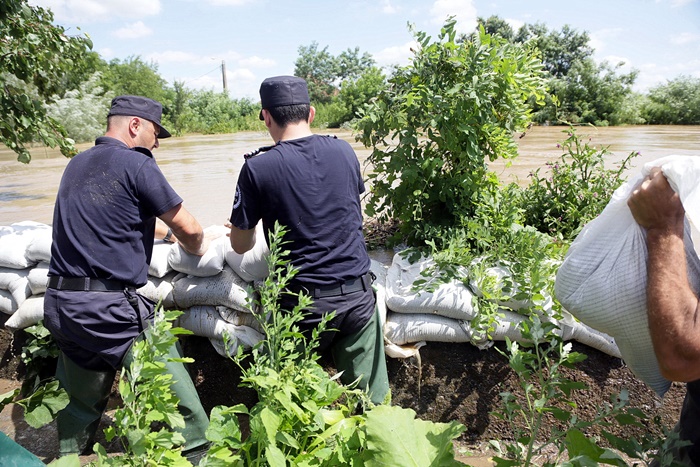 UPDATE: In localitatea Sculea aproximativ 10 gospodarii au fost inundate de apele Barzavei, iar pompierii lucreaza de zor pentru consolidarea digului cu saci de nisip.