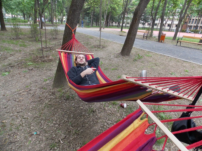 La numai o zi dupa ce au fost instalate hamacele profesionale, ce vor ramane si iarna si vara la locul lor, in Parcul Studentilor au fost montate si cele sezoniere, care vor sta doar in perioada calda. Acestea sunt mai colorate decat primele, au fost montate intre copaci, iar pentru inceput au fost puse doar opt. Studentii nu au ratat insa ocazia si au venit sa se relaxeze in hamace.