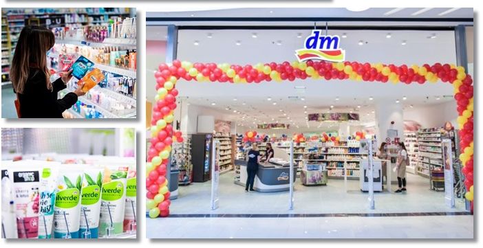 Obiectivul companiei este să încurajeze un stil de viață sănătos și sustenabil, punând la dispoziția clienților cât mai multe produse sănătoase, ecologice și durabile. În ultimii ani microparticulele din plastic au fost înlocuite cu materii prime naturale și regenerabile. Produsele care au ambalaj sau conținut ecologic sunt întotdeauna semnalate pe etichete, la raft și în campanii dedicate. Din categoria inovațiilor verzi amintim stația de reumplere pentru detergenți, care va fi lansată în 2021. Datorită celor menționate, clienții dm au arătat că au încredere în produsele drogheriei. Drogheriile dm au o gamă de peste 14.000 de produse din categoriile frumusețe și sănătate, bebe și copii, îngrijire casă și foto, la care se adaugă cele pentru animalele de companie, textile, precum și articole sezoniere sau în ediție limitată.