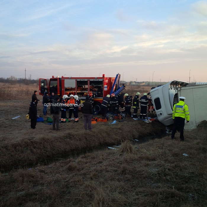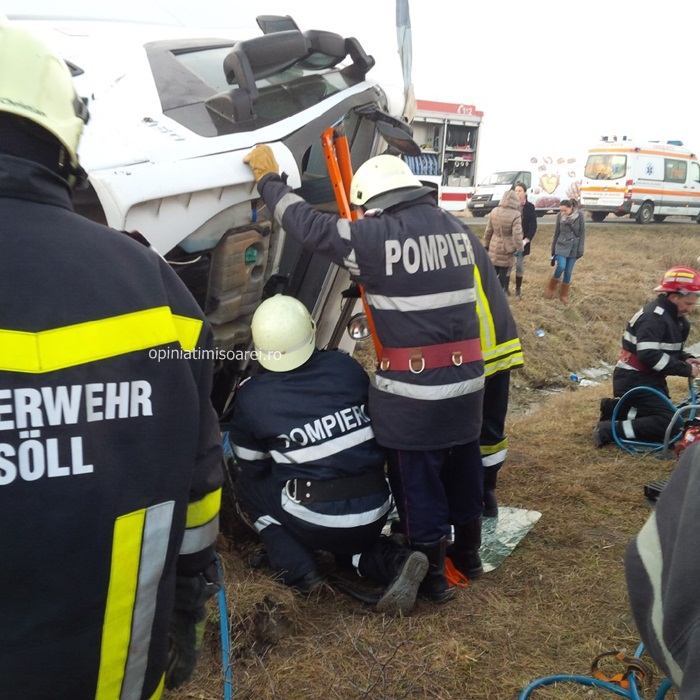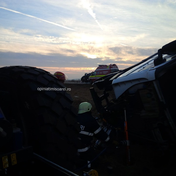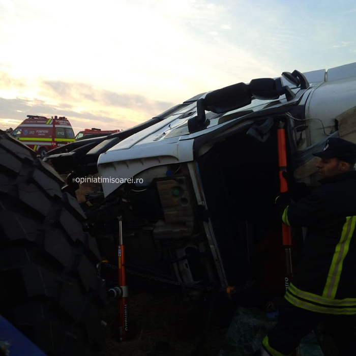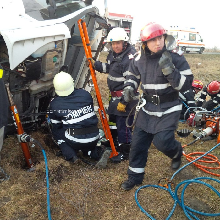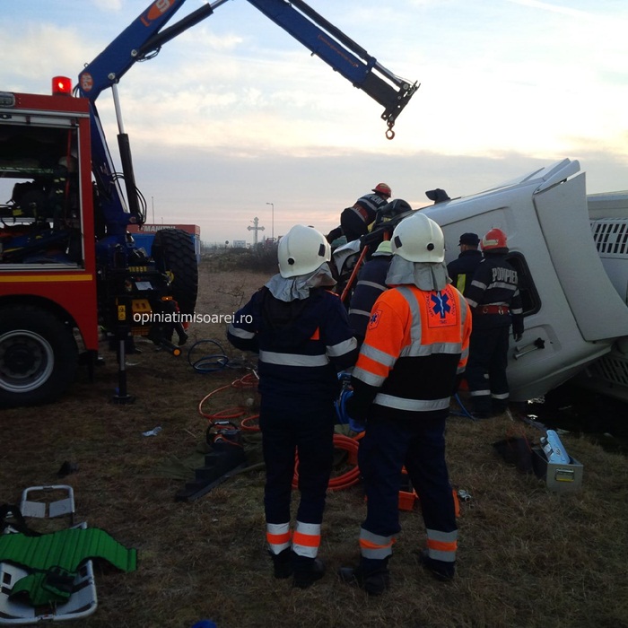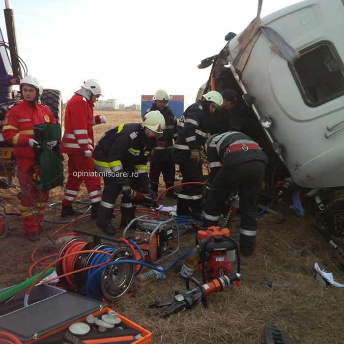 Pompierii, politistii si ambulantele au sosit imediat la locul tragediei. Echipajul de la descarcerare s-a chinuit aproape doua ore sa-l recupereze pe soferul autotrenului din cabina zdrobita. Omul a fost transportat de urgenta la Spitalul Judetean Timisoara cu o rana deschisa la piciorul stang.