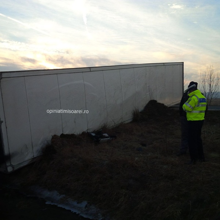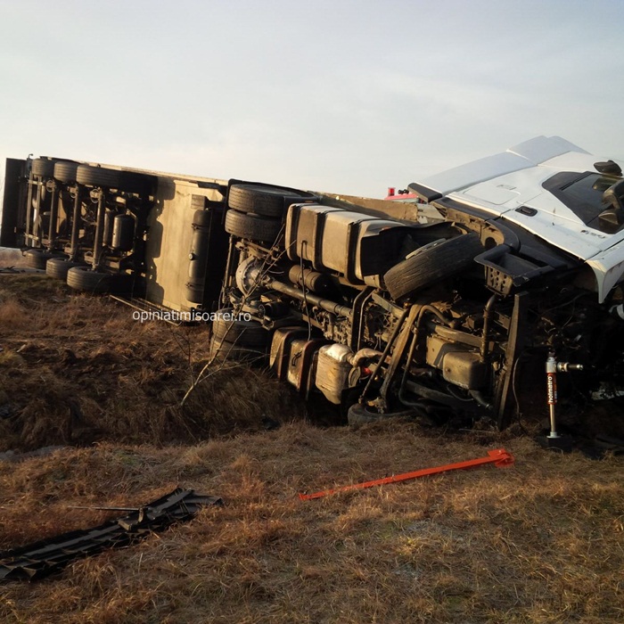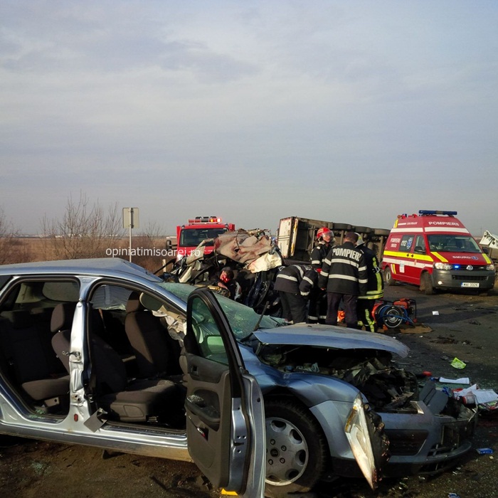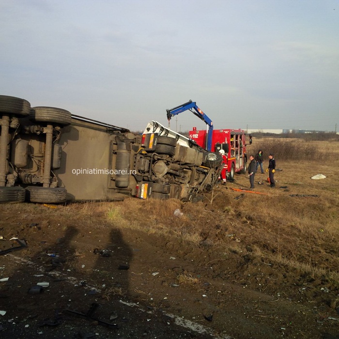 TIMISOARA. Groaznic accident pe soseaua ce leaga Timisoara de Lugoj, intre Ghiroda si Remetea Mare. Doi oameni au murit, dupa ce masinile in care se aflau au fost izbite de un TIR. Autotrenul, la randu-i s-a rasturnat intr-un sant.