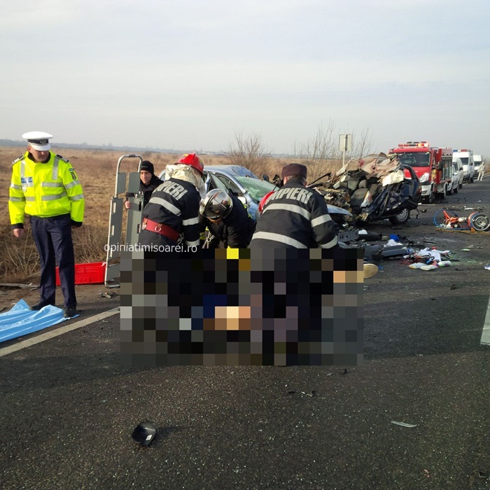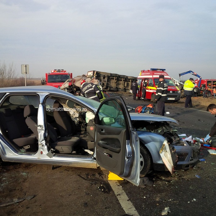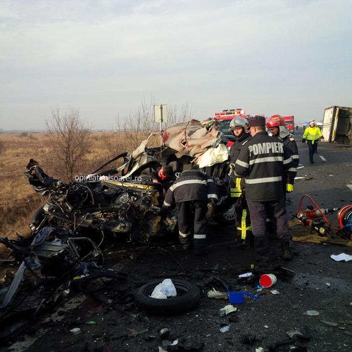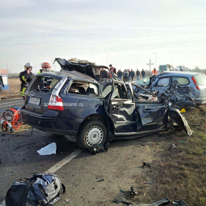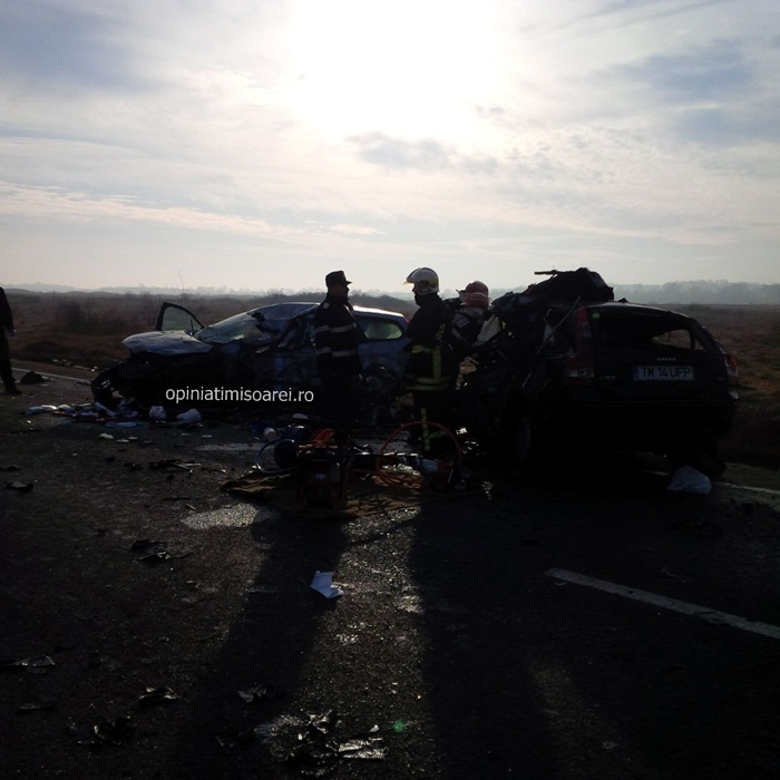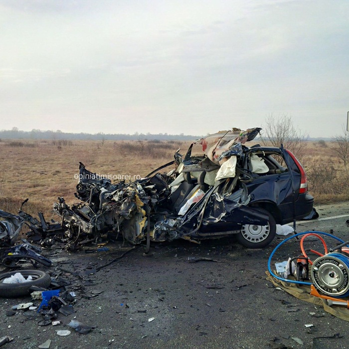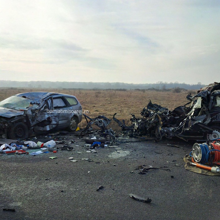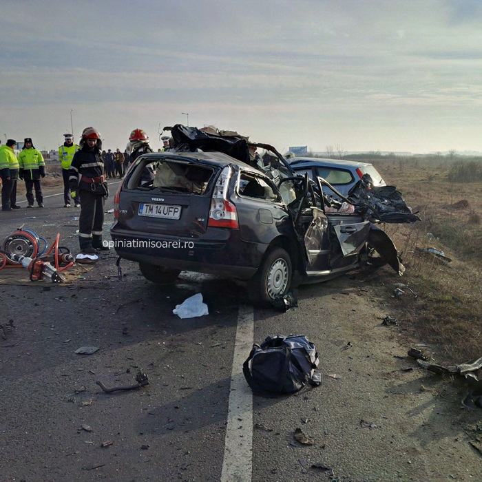 Cele doua autoturisme implicate in accident se indreptau spre Lugoj. In apropiere de Remetea Mare, soferul unei masini Volvo de 29 de ani a intrat intr-o depasire riscanta. Din fata venea un TIR, al carui conducator a facut manevre disperate sa evite impactul. Dar in zadar. Omul a tras brusc de volan, iar autotrenul a lovit atat masina Volvo aflata pe contrasens, cat si un Ford care venea in urma ei si care era condusa de un barbat de 68 de ani. Soferii celor doua autoturisme au murit pe loc. Unul dintre autoturisme a fost proiectat peste celalalt si s-a transformat intr-un morman de fiare.