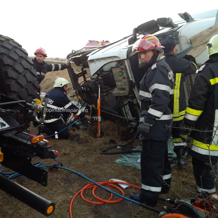 TIR-ul s-a rasturnat pe marginea drumului, iar soferul a ramas incarcerat in cabina.