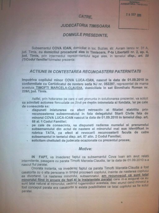 In aceeasi zi, intrigat de solutia care nu spunea nimic de vreun test de paternitate, Ioan Cova a inregistrat la Judecatoria Timisoara o actiune in contestarea recunoasterii paternitatii.