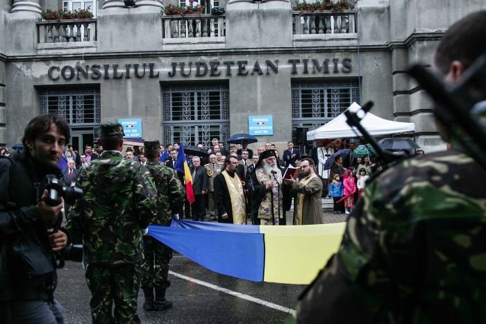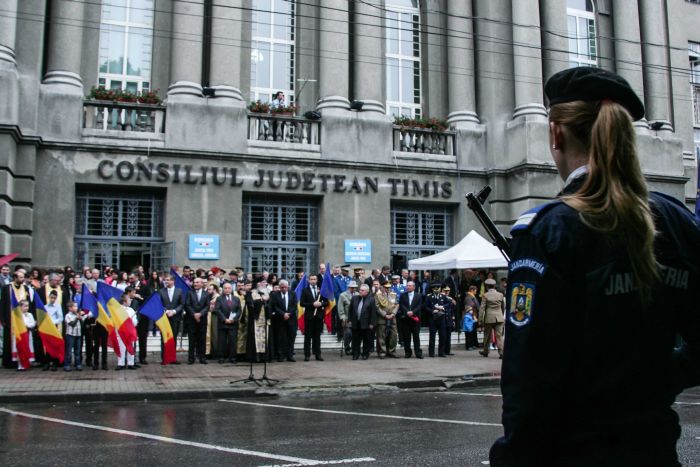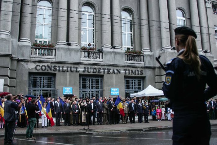 Aniversarea Drapelului a inceput la ora 9 cu slujba de sfintire a Drapelului la Catedrala, apoi a urmat ceremonia de inaltare a Drapelului in fata Palatului Administrativ si un recital de poezie sustinut de elevii de la Liceul Teoretic ”Grigore Moisil” si de la Liceul Teoretic ”Vlad Tepes” din Timisoara. Toate acestea in ciuda vremii ploioase de afara.