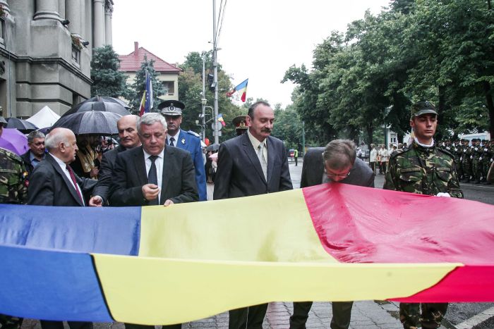TIMISOARA. Zeci de militari din Timisoara au defilat purtand Drapelul National al Romaniei, in fata Palatului Administrativ din Timisoara, de Ziua Drapelului. Momentul a avut loc in prezenta conducerii Consiliului Judetean Timis si a Prefecturii Timis, dar si a unor consilieri judeteni, sefi de institutii sau timisoreni.