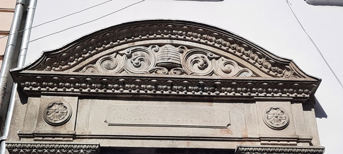 „Elementul decorativ central este o metopă fixată în tencuiala arcadei mici pe care sunt reprezentate flori și elemente vegetale spiralice care încadrează un stup de albine. Devine astfel evident că încă din faza de proiectare, parterul funcţional al clădirii urma să devină sediul unei bănci, stupul de albine fiind folosit la marcarea instituţiilor bancare încă din perioada eclectică, devenind un motiv uzual la începutul secolului 20„, se arată în Analele Banatului.