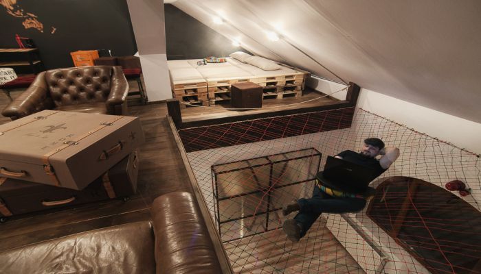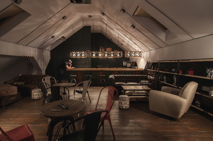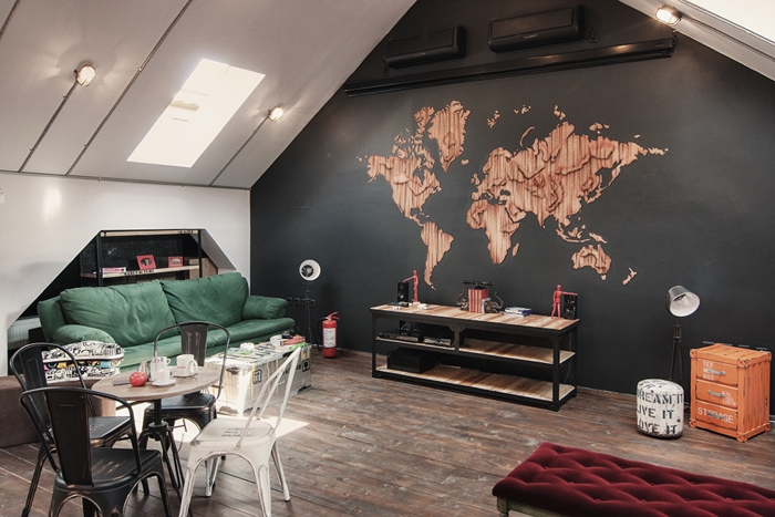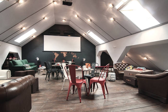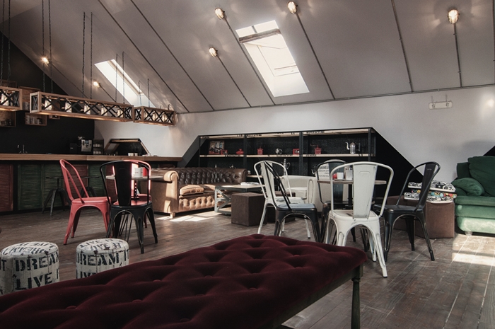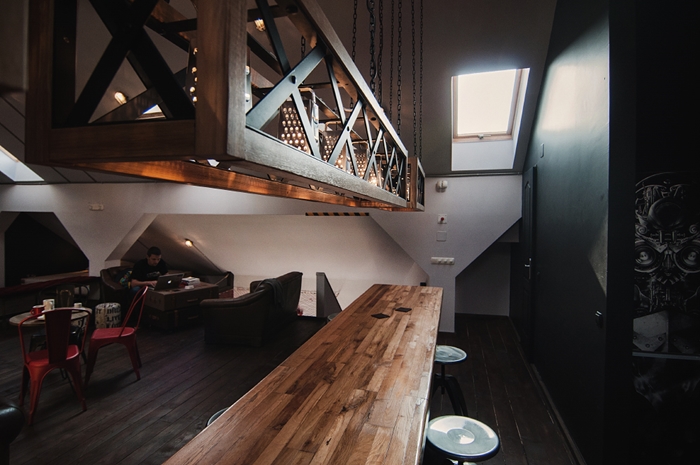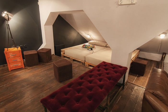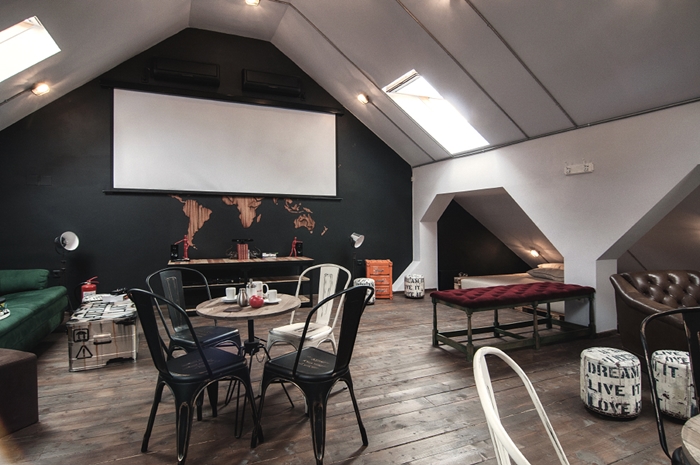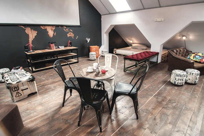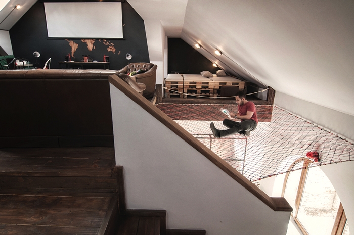 Odata ce pornim, hotarati, spre zona de lounge, adica cel de-al treilea nivel, respectiv mansarda, ne lovim privirea de un tavan oarecum nazdravan, in sensul ca se abate de la caracteristicile obisnuite ale unei zone de de lounge. Aici regasim o plasa uriasa pe post de hamac, chiar deasupra treptelor spiralate. Oricine ajunge in acest loc realizeaza ca urmatorul spatiu nu va fi unul pretentios si simte cum curiozitatea creste la fiecare pas. Urcand, descoperim pe lateralul scarii, corpuri de iluminat cu umbre aparente sub dimensiunea unor ventilatoare clasice. Corpurile de iluminat industrial-nepretentioase, mobilierul din materiale reciclate intr-un stil neunitar, cu forme si culori aparent dezordonate, harta lumii, vin sa sublinieze ideea de “global awareness”. Blatul din lemn masic, corpuri de iluminat din razatoare ce capata aici o alta functionalitate, patul din coltul mansardei, evident confectionat din vechi paleti, taburetii si mesele din vechi genti de voiaj, toate vin sa sublinieze ideea de vintage intr-un amestec firesc cu industrialul ca un nou curent in design.