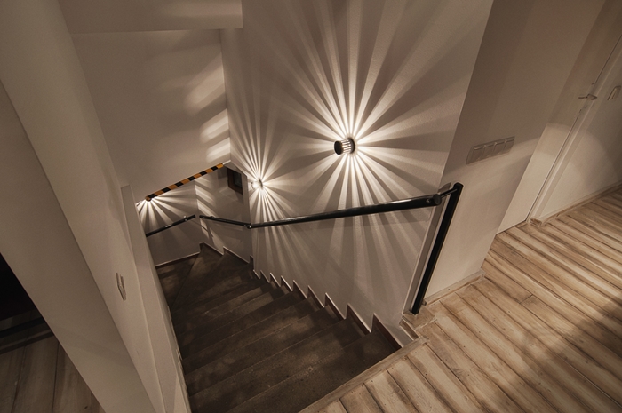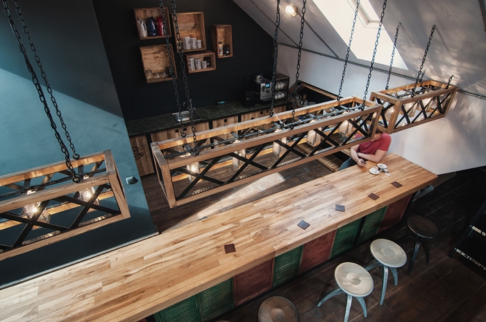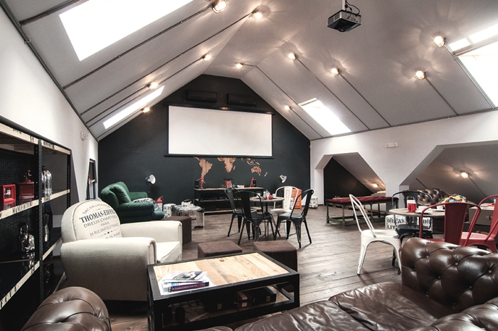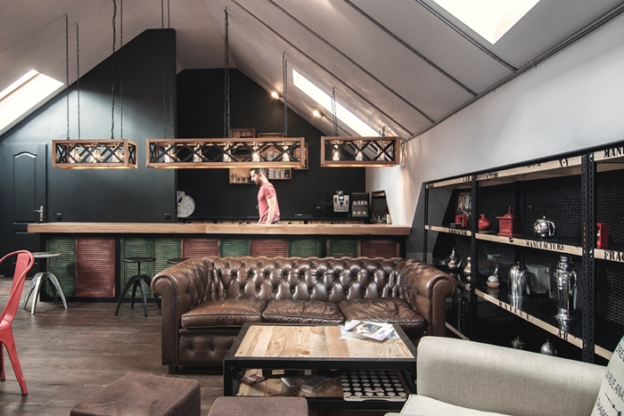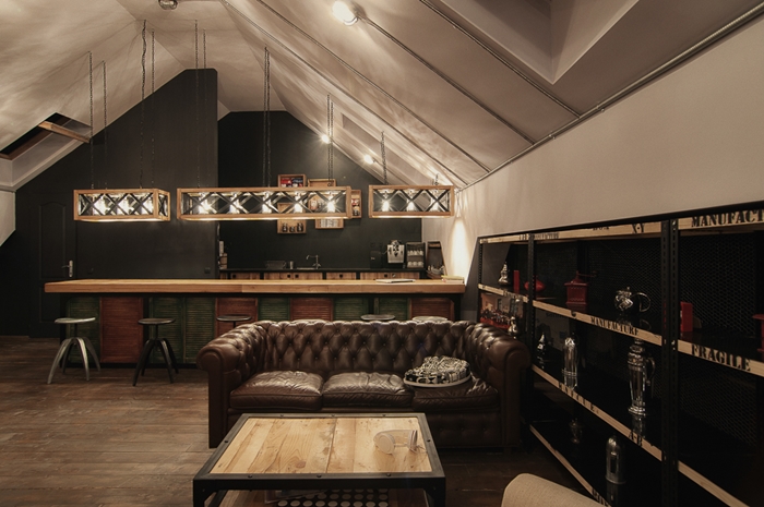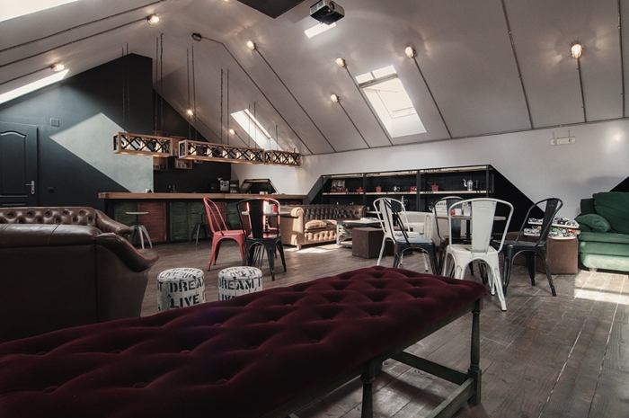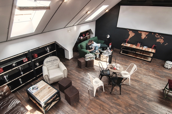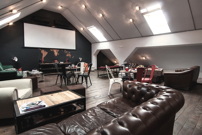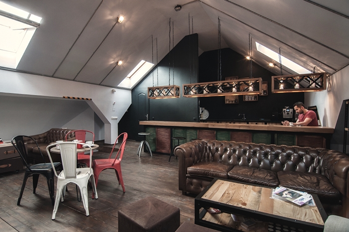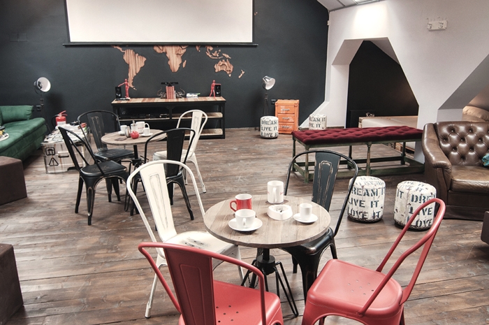 Odata ce pornim, hotarati, spre zona de lounge, adica cel de-al treilea nivel, respectiv mansarda, ne lovim privirea de un tavan oarecum nazdravan, in sensul ca se abate de la caracteristicile obisnuite ale unei zone de de lounge. Aici regasim o plasa uriasa pe post de hamac, chiar deasupra treptelor spiralate. Oricine ajunge in acest loc realizeaza ca urmatorul spatiu nu va fi unul pretentios si simte cum curiozitatea creste la fiecare pas. Urcand, descoperim pe lateralul scarii, corpuri de iluminat cu umbre aparente sub dimensiunea unor ventilatoare clasice. Corpurile de iluminat industrial-nepretentioase, mobilierul din materiale reciclate intr-un stil neunitar, cu forme si culori aparent dezordonate, harta lumii, vin sa sublinieze ideea de “global awareness”. Blatul din lemn masic, corpuri de iluminat din razatoare ce capata aici o alta functionalitate, patul din coltul mansardei, evident confectionat din vechi paleti, taburetii si mesele din vechi genti de voiaj, toate vin sa sublinieze ideea de vintage intr-un amestec firesc cu industrialul ca un nou curent in design.