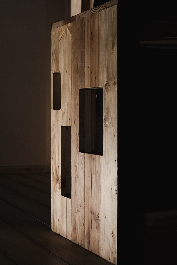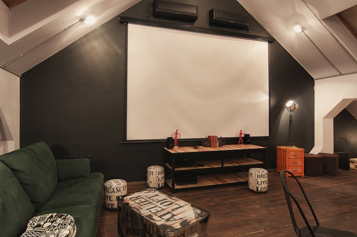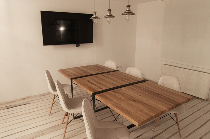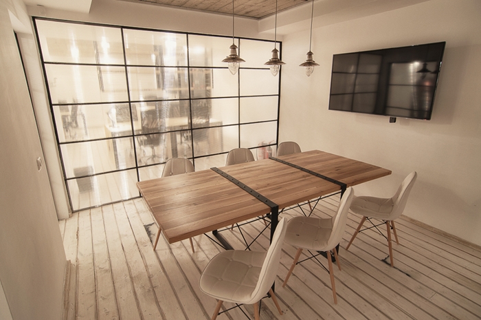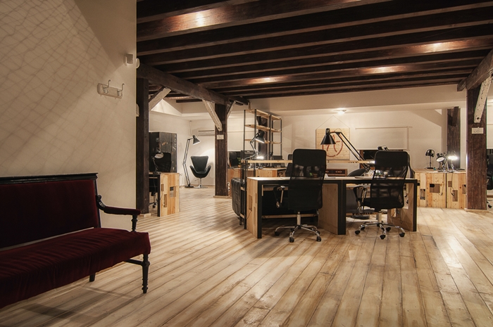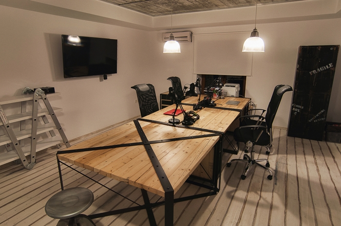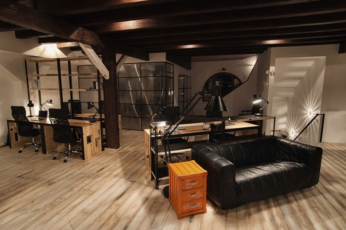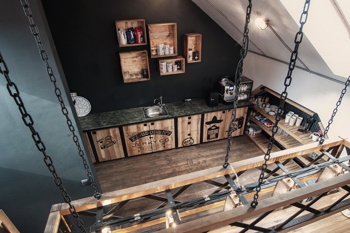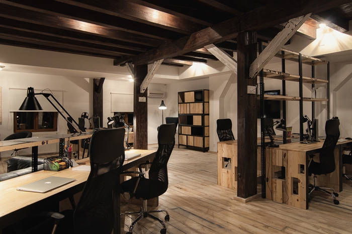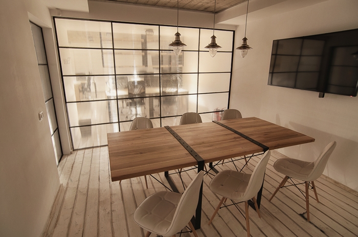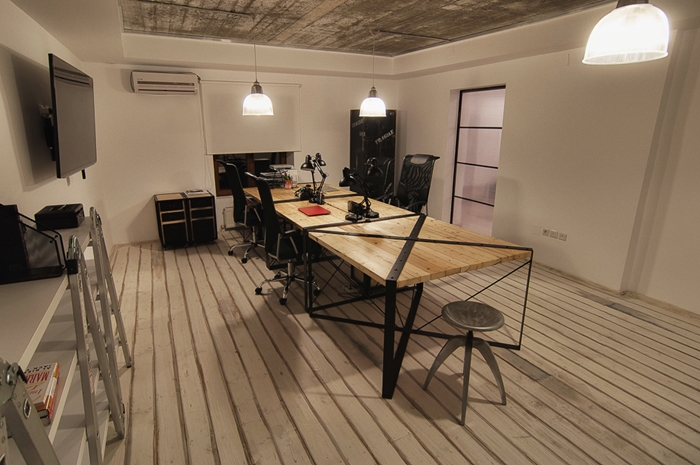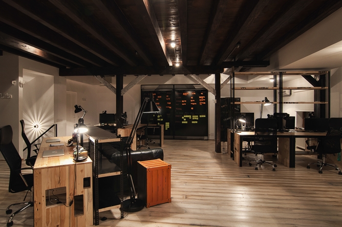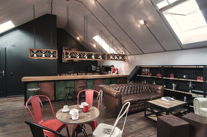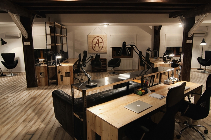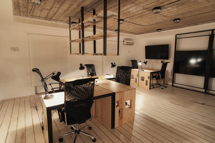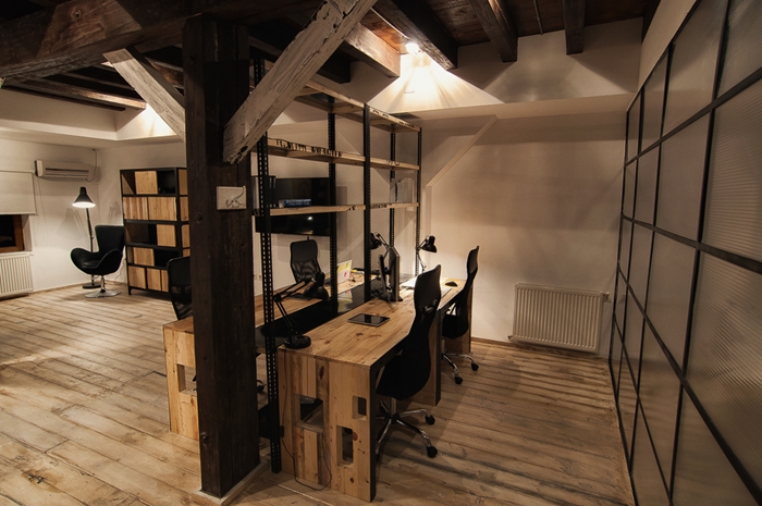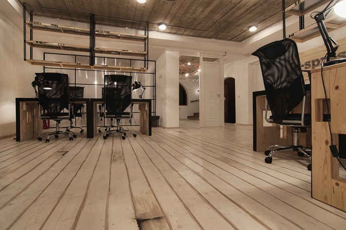 Open space-ul, atipic, se desfasoara pe cel de-al doilea nivel. Acesta se diferentiaza atat prin mobilierul realizat din paleti reciclati si structura industriala din lemn masiv, in partea de sus a incaperii, cat si prin dispunerea neregulata a acestuia in jurul unei zone centrale de reculegere. Aceasta zona de liniste si relaxare este marcata prin prezenta unor canapele, masive, din materiale naturale.