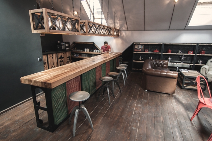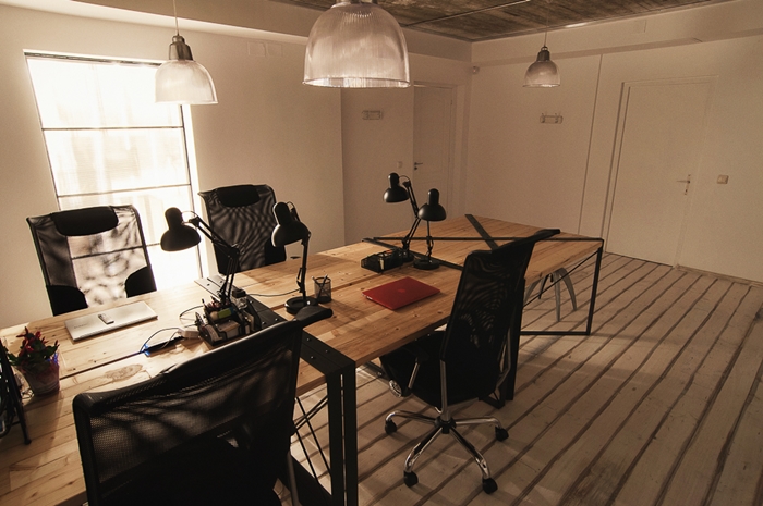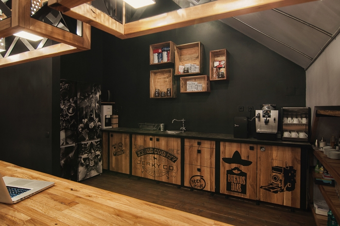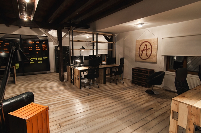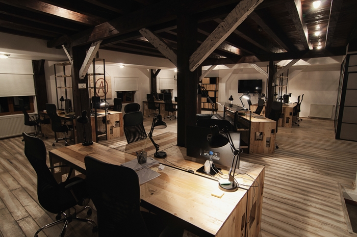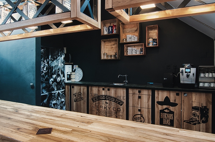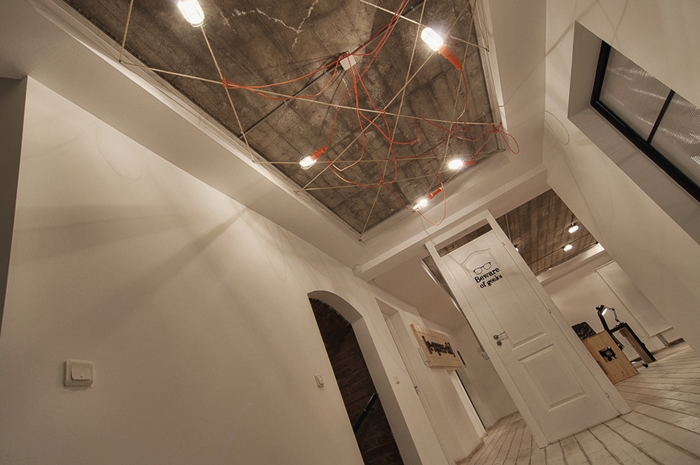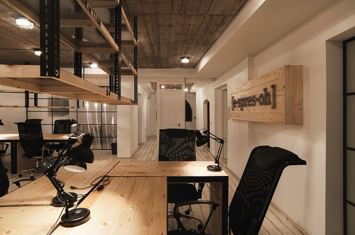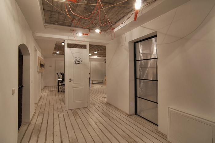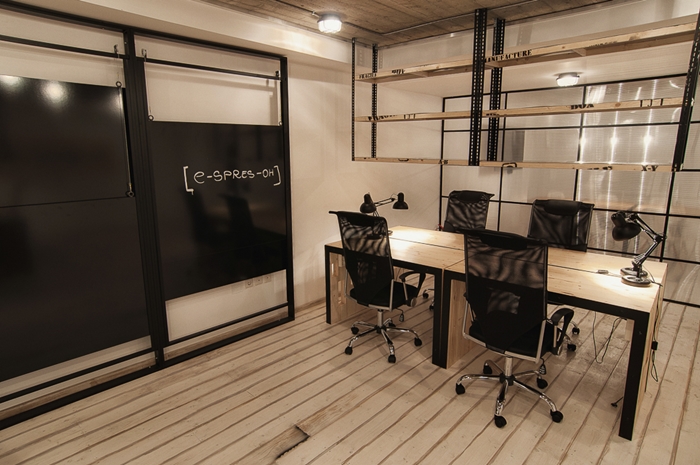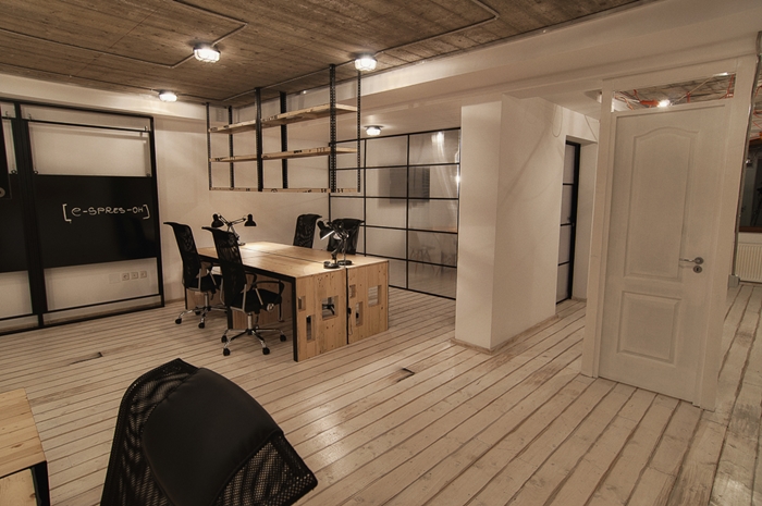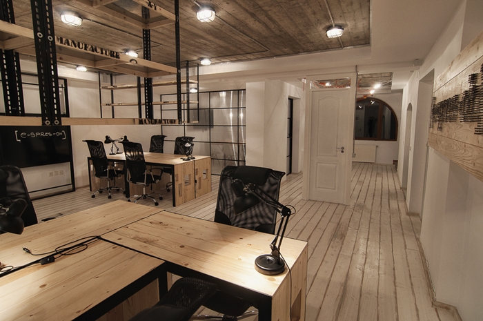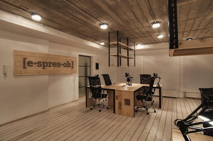 Amenajarea spatiului este realizata de Ezzo Design, cei care au reusit sa creeze un alt univers modern – unul in care domina relaxarea, creatia si brainstormingul. Acestea sunt cele trei elemente care se regasesc in [e-spres-oh] – un studio creat special pentru necesitatile soft-istilor. Universul plin de umor si culoare se anunta inca de la primul nivel, de la prima usa care prevesteste o altfel de experienta, ascunsa in spatele “usii” – prin inscriptia auto-ironica “beware of geeks”. Cu un usor zambet, descoperim ca in spatele usii este de fapt, un spatiu de birouri care respira un aer relaxat, dat de lemn si podele shabby-chic, de curentul corpurilor de ilumant in stil industrial.