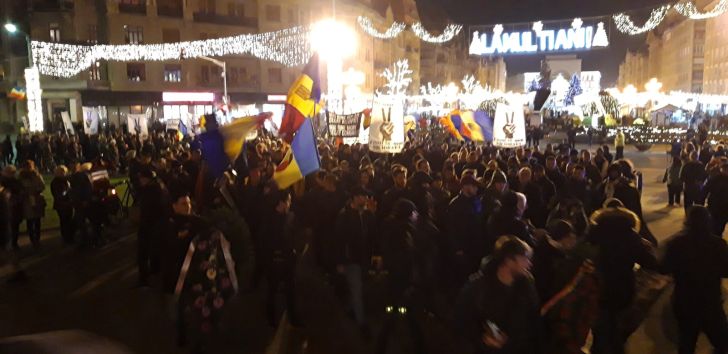 ‘Cine uita e complice!‘, acesta este motto-ul cu care au pornit pe strazile Timisoarei sute de oameni, in jurul orei 18.00. Tinerii au purtat flori, torte, steaguri tricolore si steaguri ale Revolutiei cu vechea stema decupata. Tinerii au strigat mesaje precum ”Eroii nu mor niciodata!”, „Cinste lor, cinste lor, Eroilor” si „Libertate”, alaturi de semnul victoriei.