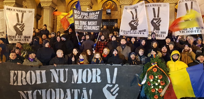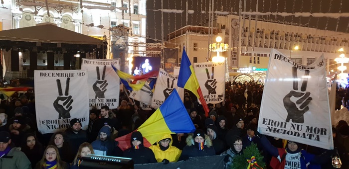 ‘Cine uita e complice!‘, acesta este motto-ul cu care au pornit pe strazile Timisoarei sute de oameni, in jurul orei 17.00. Tinerii au purtat flori, torte, steaguri tricolore si steaguri ale Revolutiei cu vechea stema decupata. Tinerii au strigat mesaje precum ”Eroii nu mor niciodata!”, „Cinste lor, cinte lor, Eroilor” si „Libertate”, alaturi de semnul victoriei.