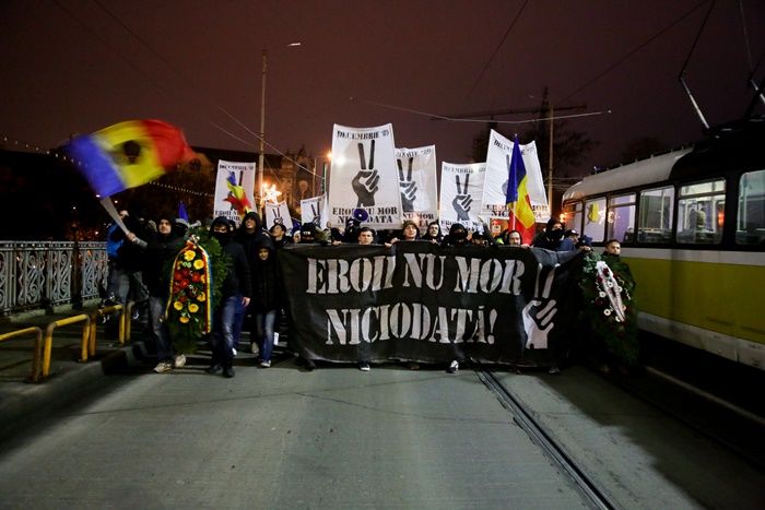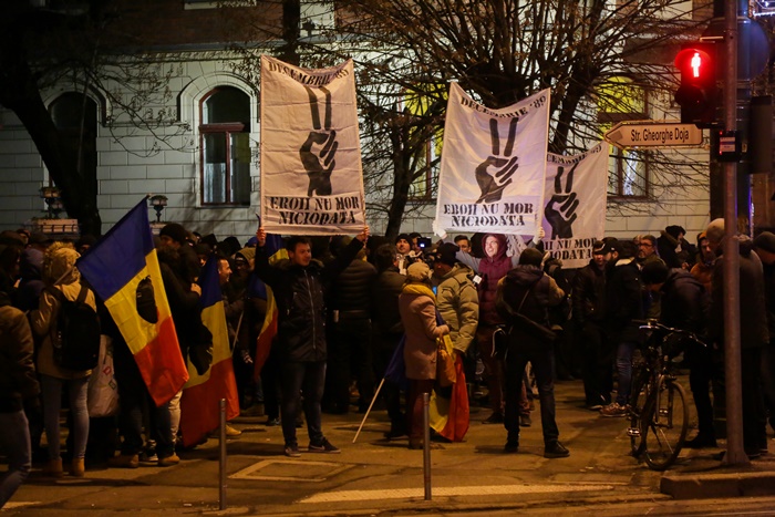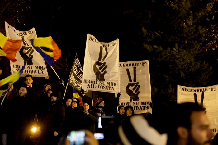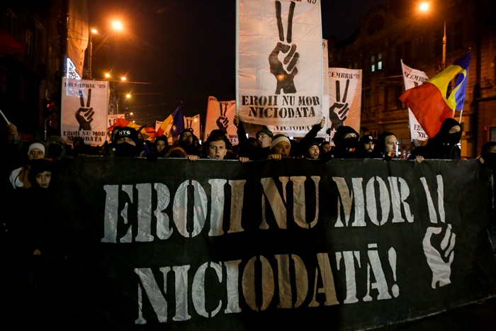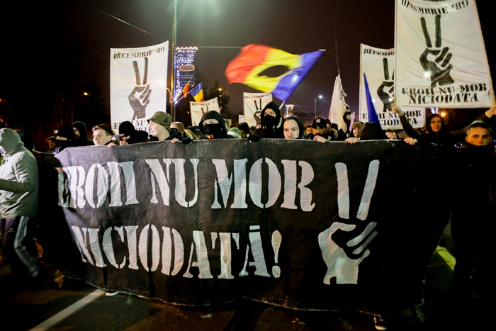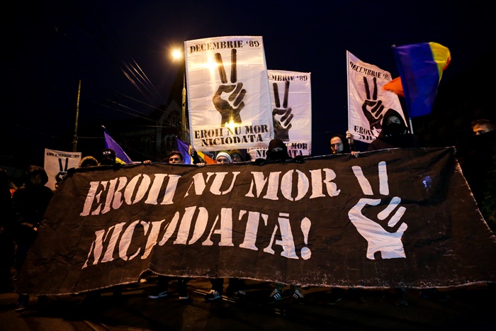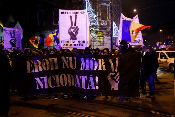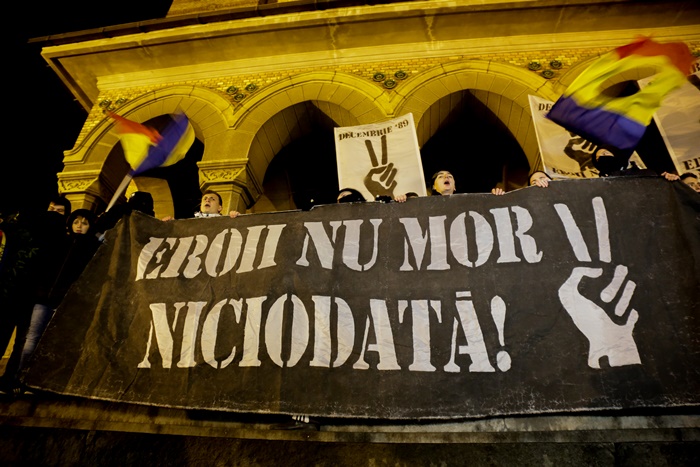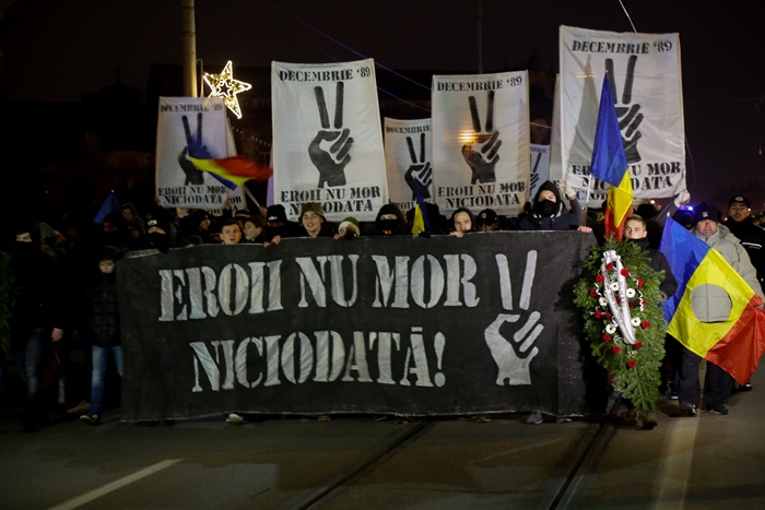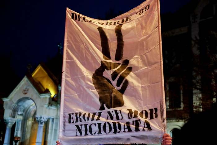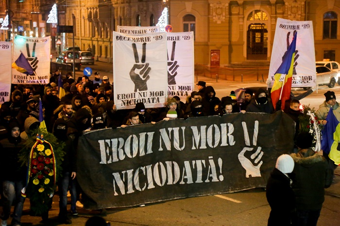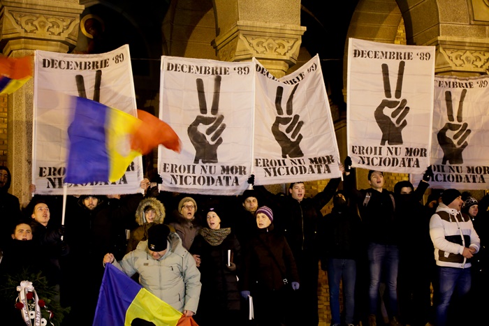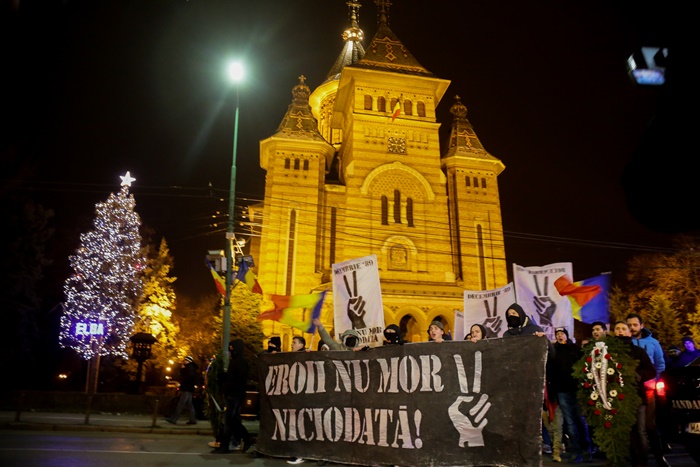 ‘Cine uita e complice!‘, acesta este motto-ul cu care au pornit pe strazile Timisoarei sute de oameni, in jurul orei 17.00. Tinerii au purtat coroane de flori, torte, steaguri tricolore si fulare alb-violet. Tinerii au purtat mesaje precum ”Eroii nu mor niciodata!”, „Cinste lor!” si „Libertate”, alaturi de semnul victoriei.