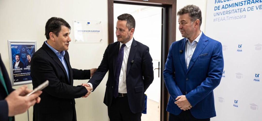 La Universitatea de Vest din Timișoara (UVT) a fost inaugurat biroul de afaceri europene dedicat studenților, un centru de comunicare care va avea rolul de a consolida cetățenia europeană, conform cu acordul de parteneriat pe care rectorul UVT, prof.univ.dr. Marilen Gabriel Pirtea, l-a agreat cu europarlamentarul Nicu Ștefănuță, vicepreședinte al Parlamentului European și alumnus UVT – FEAA 2004.