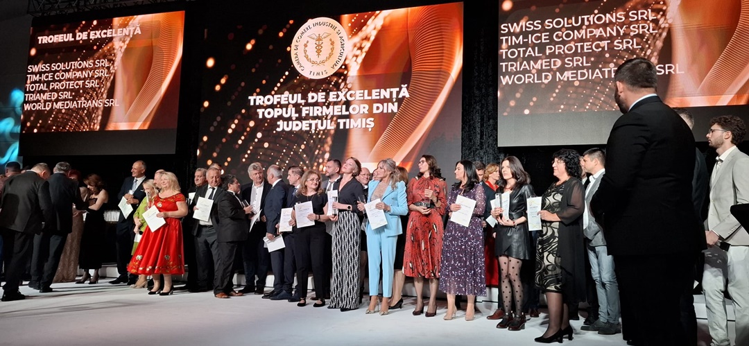“Au fost analizate 38419 firme care au depus bilantul financiar-contabil pentru 2023. Dintre acestea, 15854 au indeplinit criteriile de eligibilitate. Dintre cele 15854, doar 1865 s-au clasat pe primele locuri. Aceste 1865 care s-au clasat pe locurile 1-3 au realizat un procent de 56% din cifra de afaceri a judetului Timis. Cifra de afaceri a judetului Timis este de 24,2 miliarde euro, din care firmele clasate pe locurile 1-3 au realizat 12,2 miliarde de euro… Suntem mandri ca in topul national avem anul acesta 522 de firme care se claseaza pe locurile 1-10. Sigur ca economia din judetul nostru se incadreaza si in contextul national si ma obliga sa spun cativa indicatori referitori la situatia economica. La 30 octombrie 2024, din datele statistice judetul nostru se claseaza pe locul doi din punct de vedere al exporturilor, cu 3,7 miliarde de euro, pe locul 3 dupa valoarea importurilor, cu 3,3 miliarde de euro. Balanta comerciala, dupa cum vedeti, este pozitiva, printre putinele judete care are balanta pozitiva“, a spus Florica Chirita, presedinte CCIA Timis.