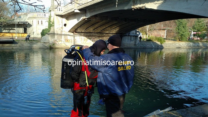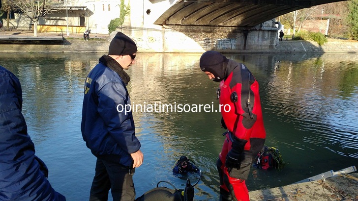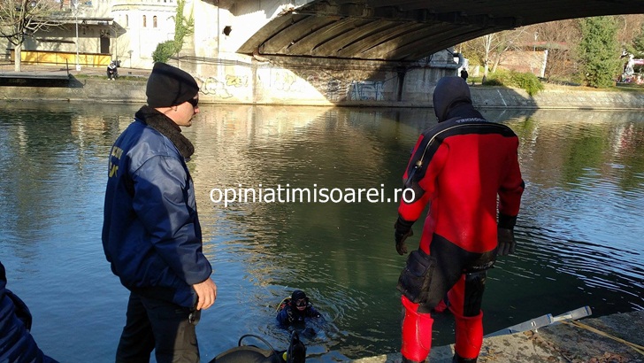 TIMISOARA. Cautari intense in apele canalului Bega la Timisoara. O echipa formata din politisti si scafandri cerceteaza amanuntit fundul raului, in zona podului de la Mihai Viteazu. In timpul verificarilor au facut o descoperire surpriza.