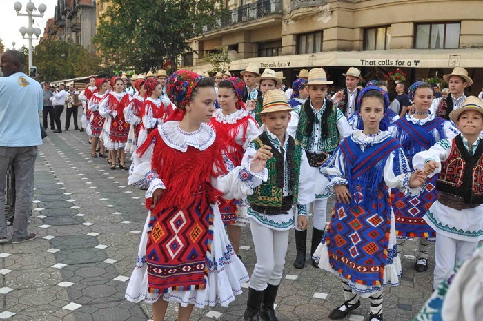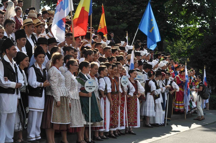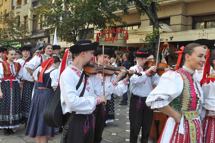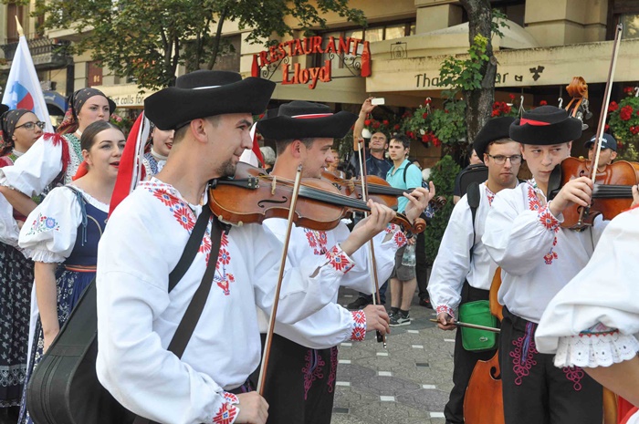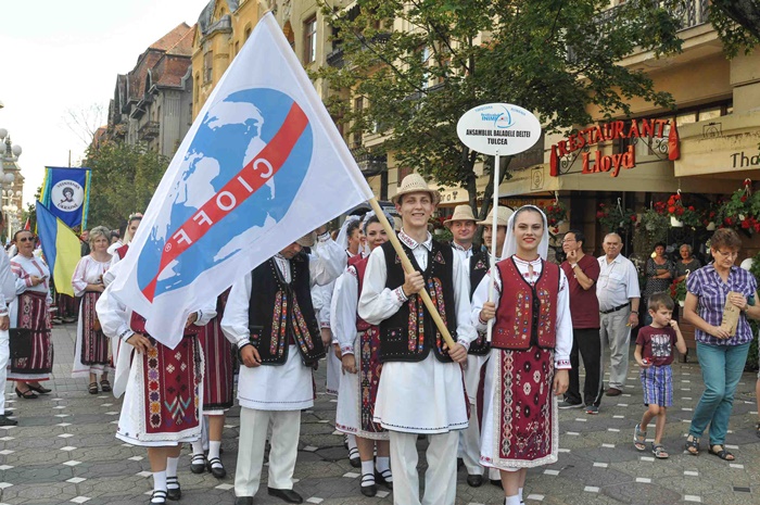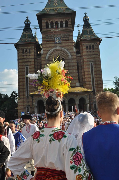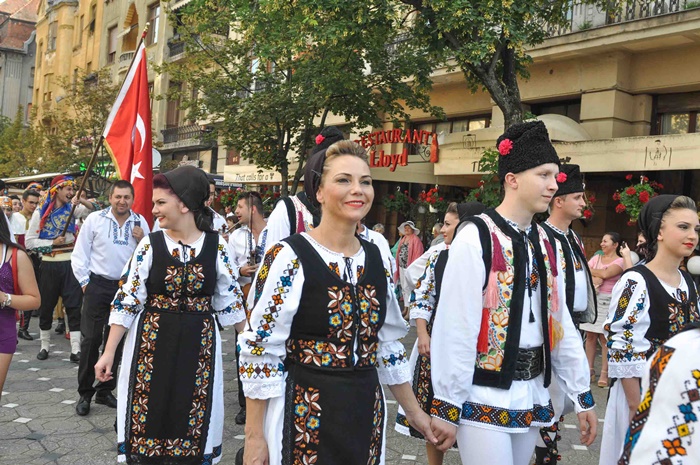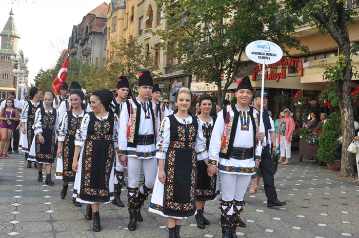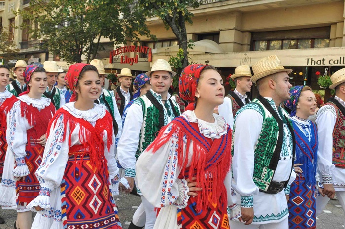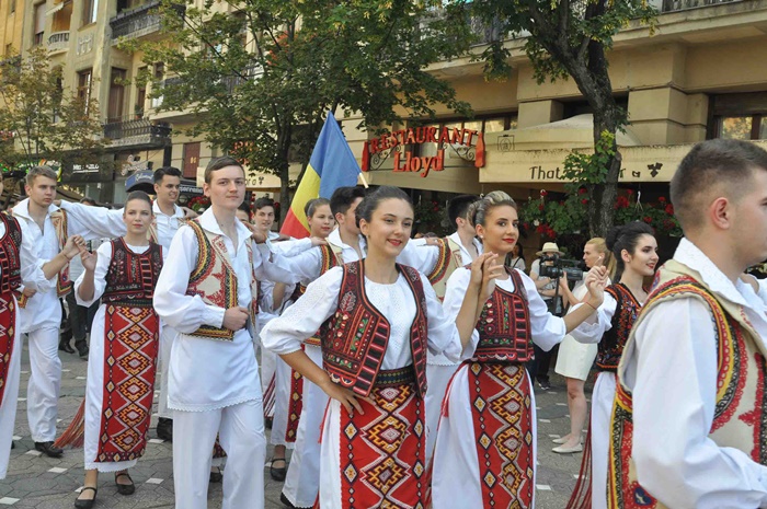 Ansambluri folclorice din Romania, dar si din strainatate au umplut centrul orasului de culoare si de ritmuri traditionale. Parada portului popular a inceput, asa cum se intampla an de an, din fata Catedralei Mitropolitane, unde s-a depus o coroana de flori in memoria eroilor Revolutiei din 1989.