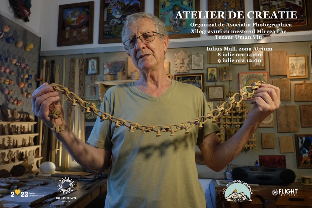 Asociația „Photographica” îi așteaptă pe timișoreni să descopere cele 24 de lucrări în care au surprins esența „Tezaurului Uman Viu”. În cadrul expoziției se vor organiza ateliere de xilogravură (gravură pe lemn), susținute de Mircea Lac, meșter în prelucrarea lemnului și a metalului. Atelierele au loc sâmbătă, la demisolul Iulius Town, în zona Atrium, de la ora 14.00, și duminică, de la ora 12.00, iar participanții vor realiza xilogravuri cu motive tradiționale, ce vor putea fi luate acasă.