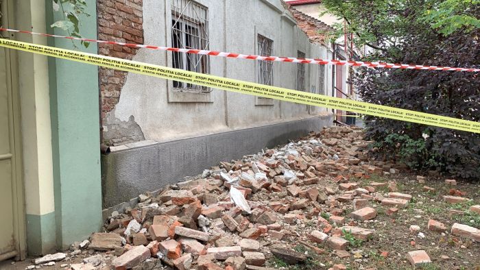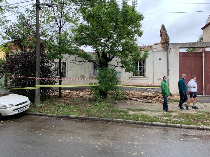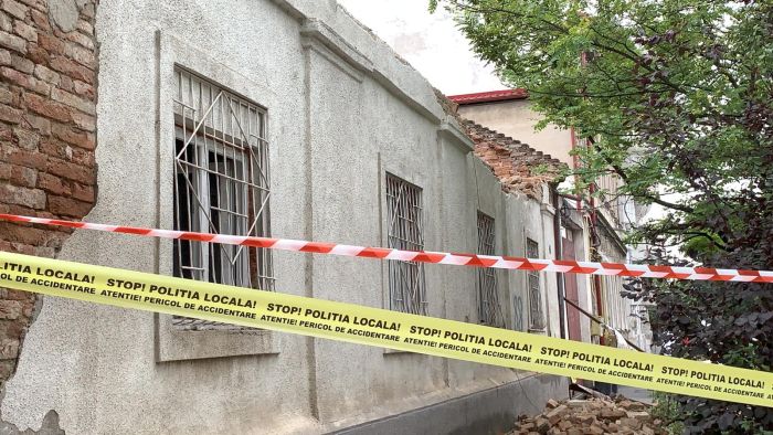 Un alt incident a avut loc in Piata Sf. Gheorghe din Timisoara. Tavanul unei cladiri partial in paragina s-a prabusit, iar bucati din acesta au cazut pe fereastră, până în strada.