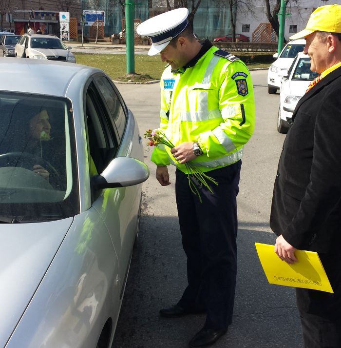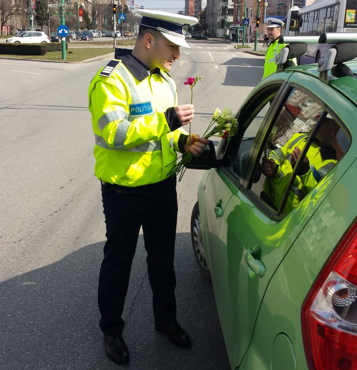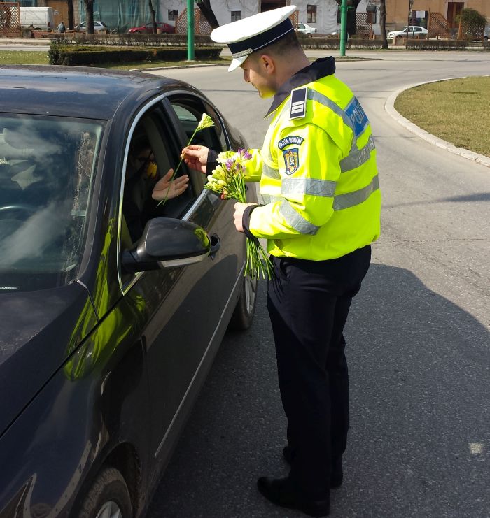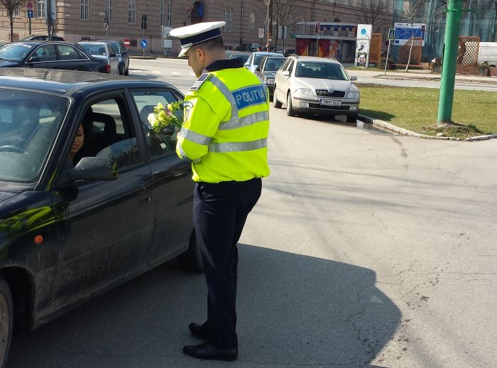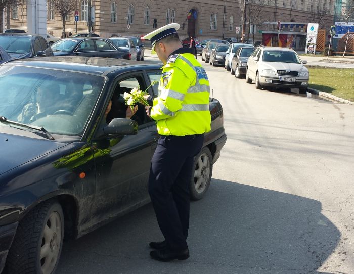 TIMIS. Femeile care s-au aflat duminica la volan au fost trase pe dreapta de politistii din Timisoara si din judet. Oamenii legii le-au daruit cate o floare, cu ocazia Zilei Internationale a Femeii.