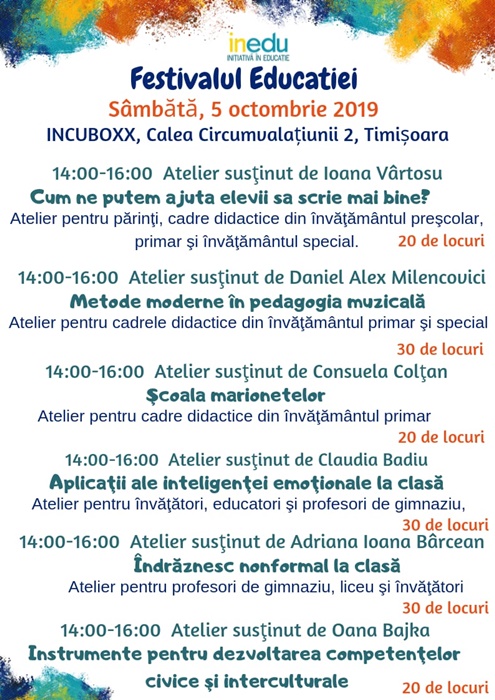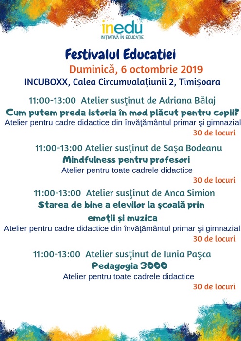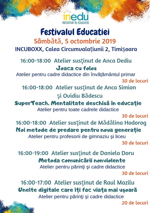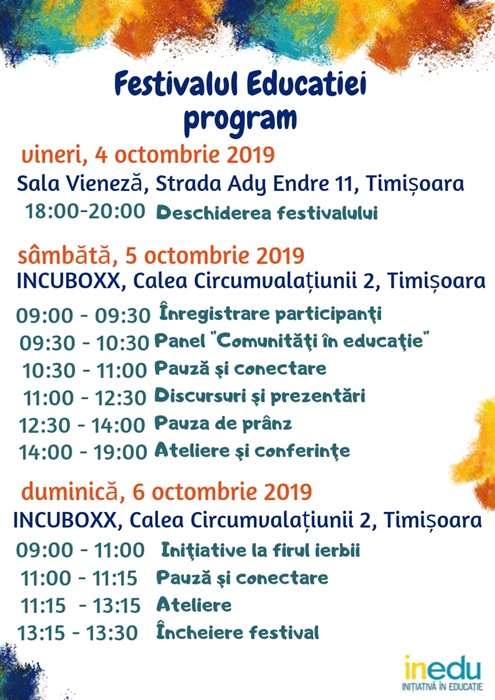 Mai multe detalii despre programul festivalului si despre speakerii invitati puteti gasi pe site-ul www.festivalul.inedu.ro si pe pagina evenimentului Program Festivalul Educatiei.