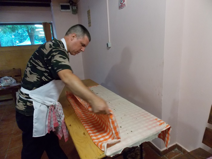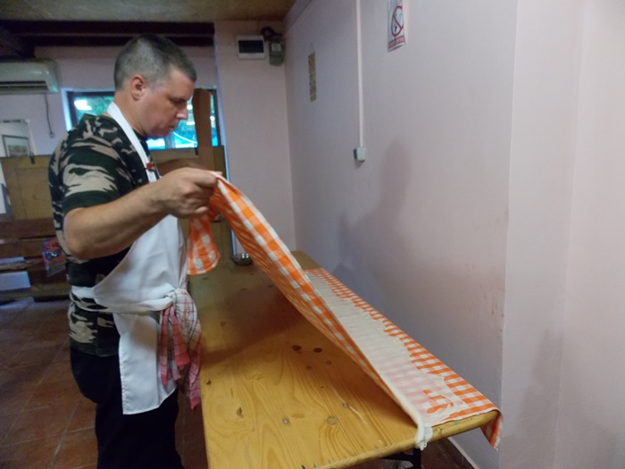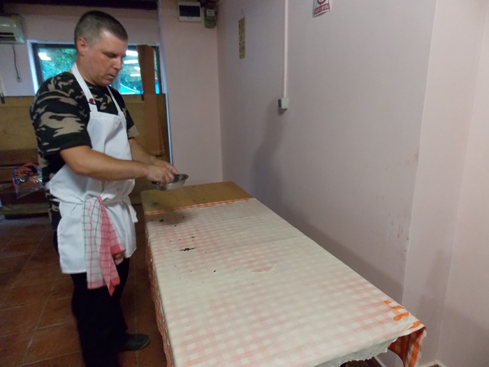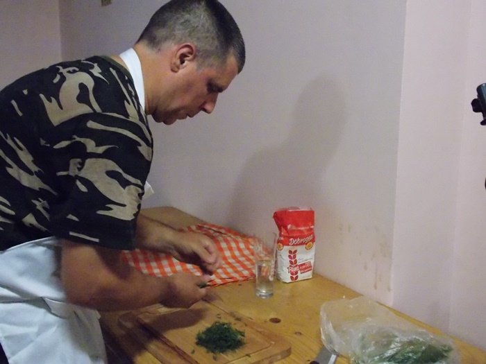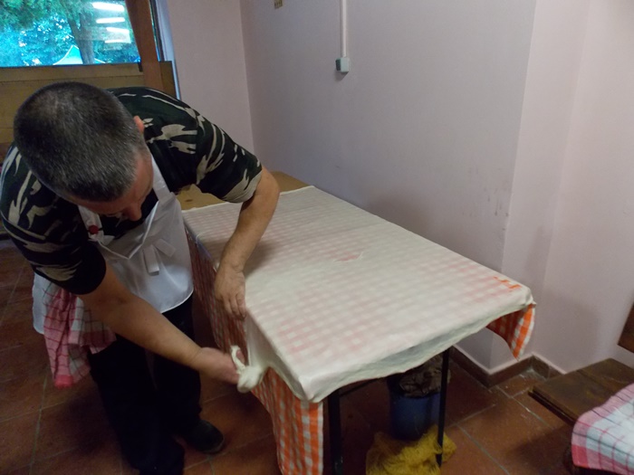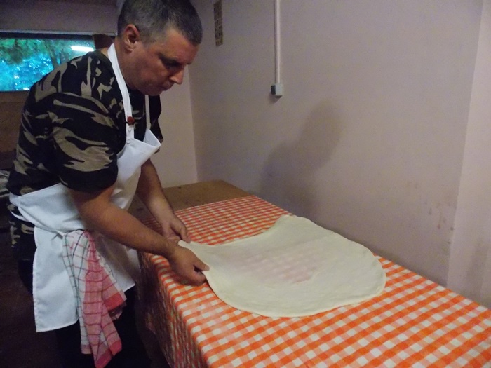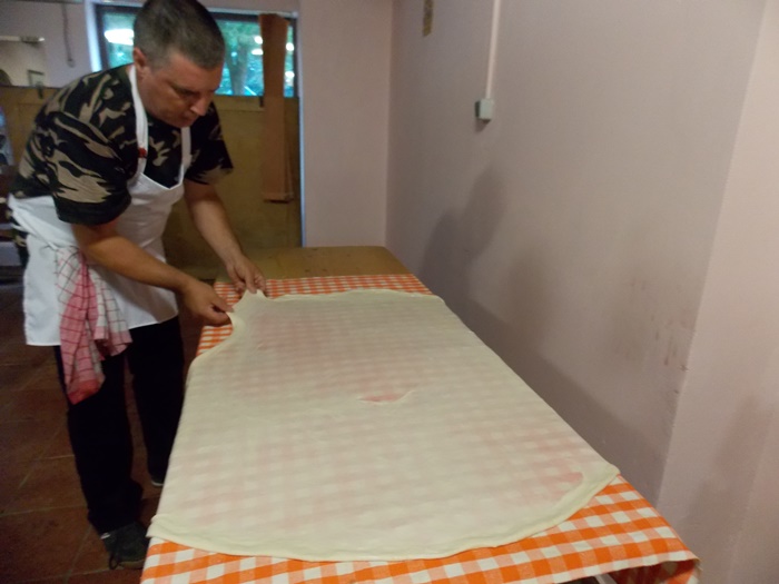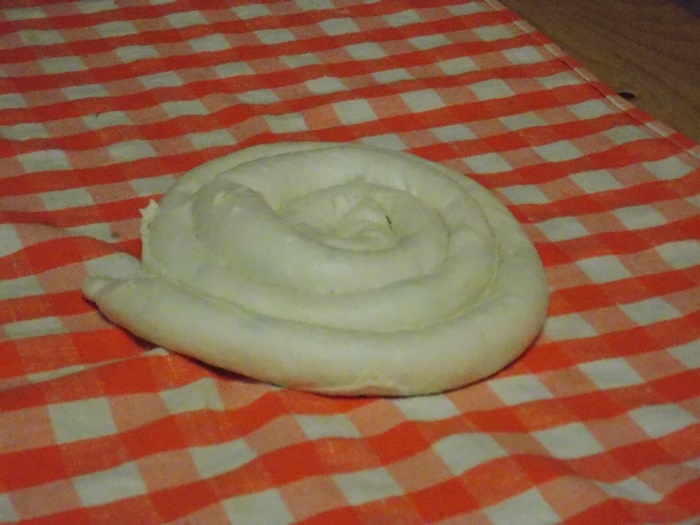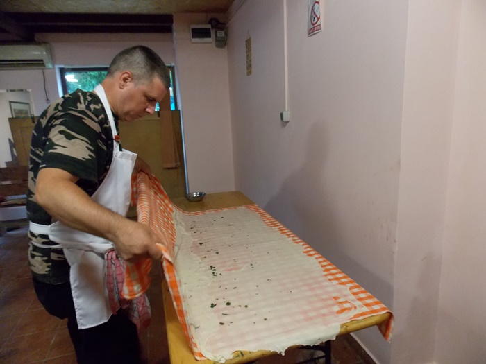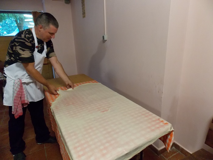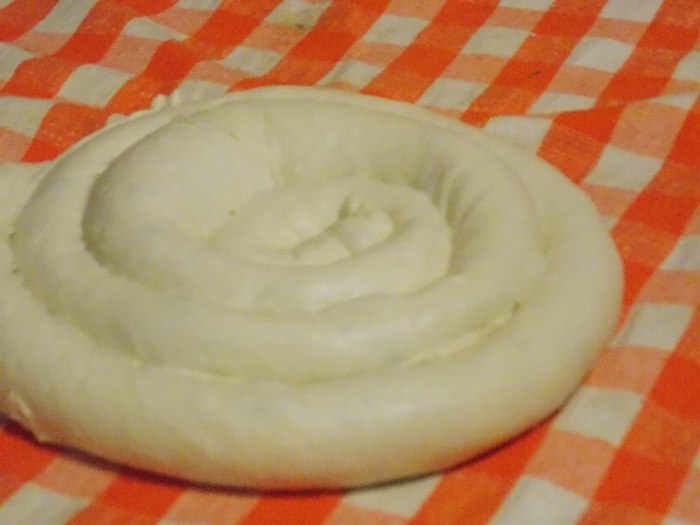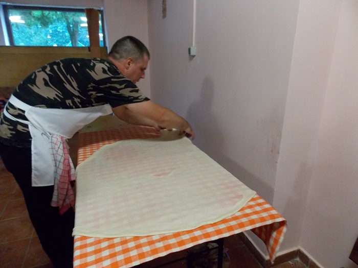 Bucatarii au intins aluatul pe toata suprafata mesei, cat mai subtire posibil, apoi cu ajutorul fetei de masa l-au rulat usor, asta dupa ce, in unele cazuri, e umplut cu branza. Se aranjeaza in forma de melc, apoi se pune cu atentie peste un fel de papricas din cartofi. Peste toate astea se aseaza un capac si nu se mai umbla la preparat cateva minute bune.