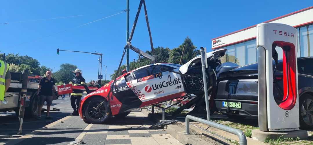 Din primele date, in mers, pe Marco Leu l-ar fi lasat franele masinii. A iesit in decor, a rupt un parapete de beton si s-a urcat cu masina de concurs pe o Tesla parcata in zona.