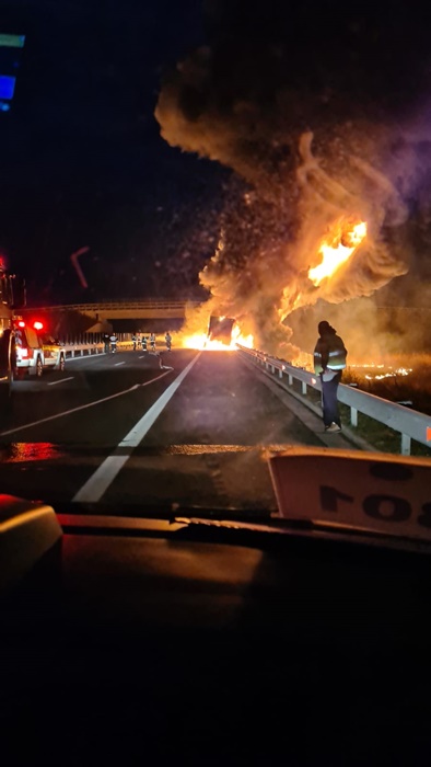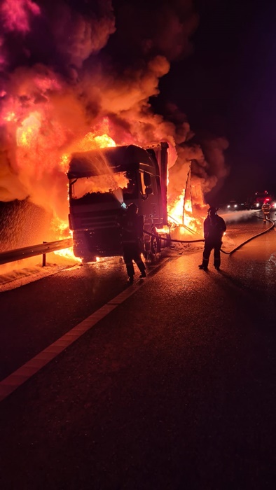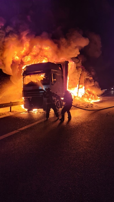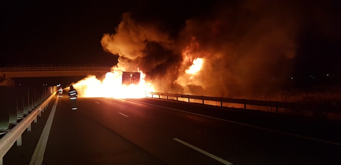 Soferul a observat la timp ce se intampla si a reusit sa traga pe dreapta si sa iasa din cabina. In cateva clipe, tirul a fost inghiti de limbile de foc.