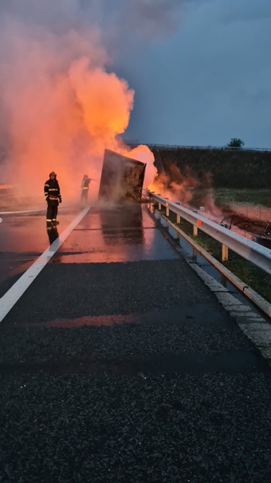 TIMISOARA. Flacari mari pe Autostrada Vestului, marti dimineata. Un autotren incarcat cu materiale plastice a fost cuprins de flacari in apropiere de Recas.