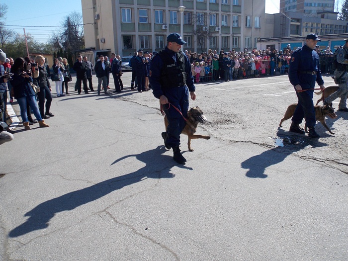 Pentru inceput, politistii au scos in fata copiilor cinci caini politisti, de interventie, asalt si detectare de urme si au prezentat un spectaculos exercitiu de dresaj.
